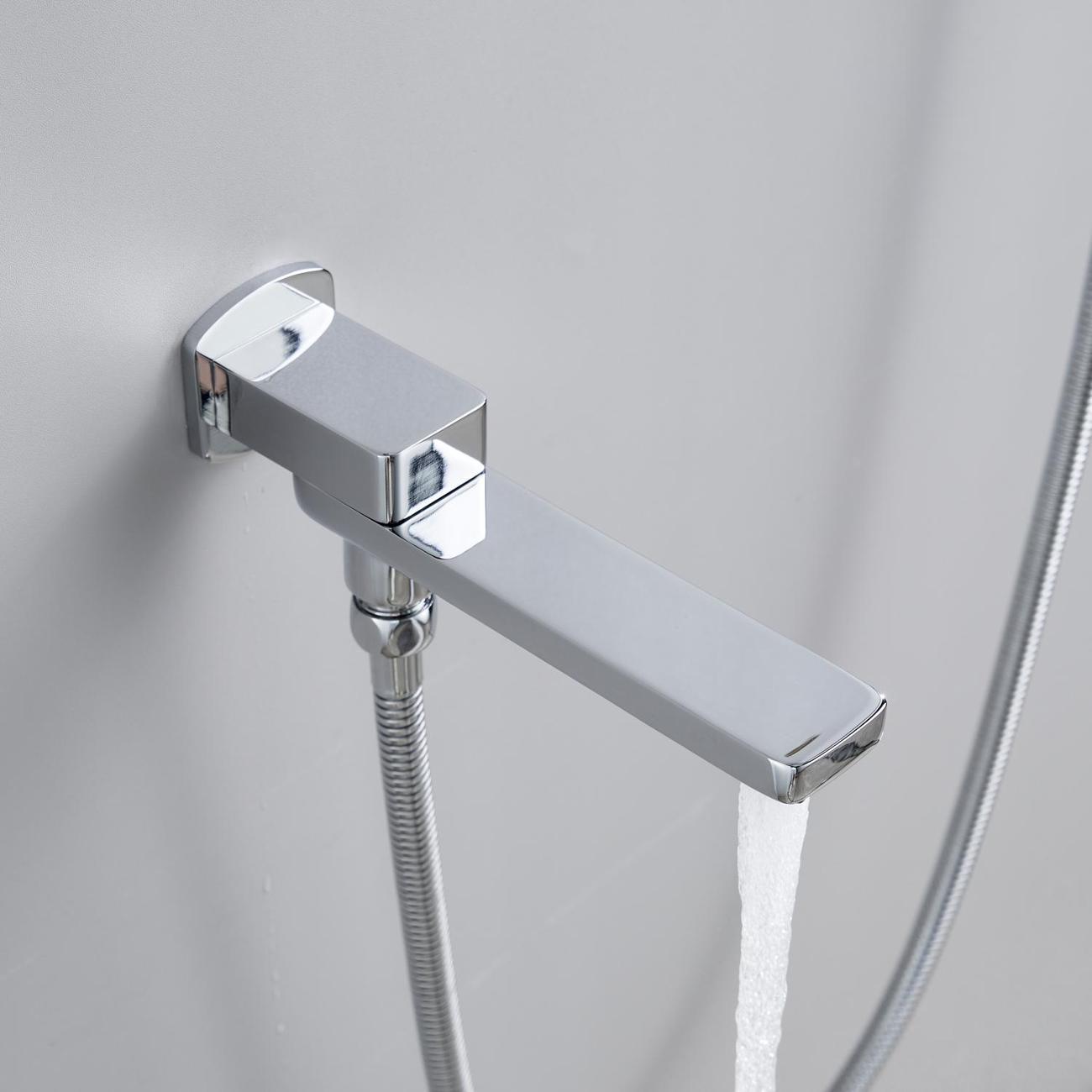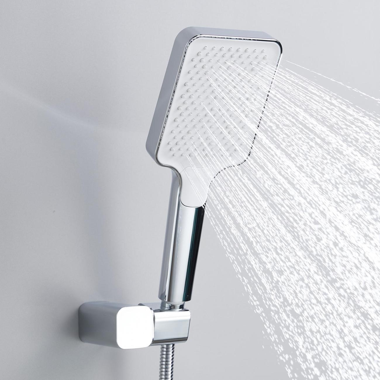 В комплект также входит ручная душевая лейка из ABS‑пластика с тремя режимами струи. Силиконовые форсунки лейки упрощают уход за изделием, а настенный держатель позволяет регулировать её наклон для максимально комфортного использования.