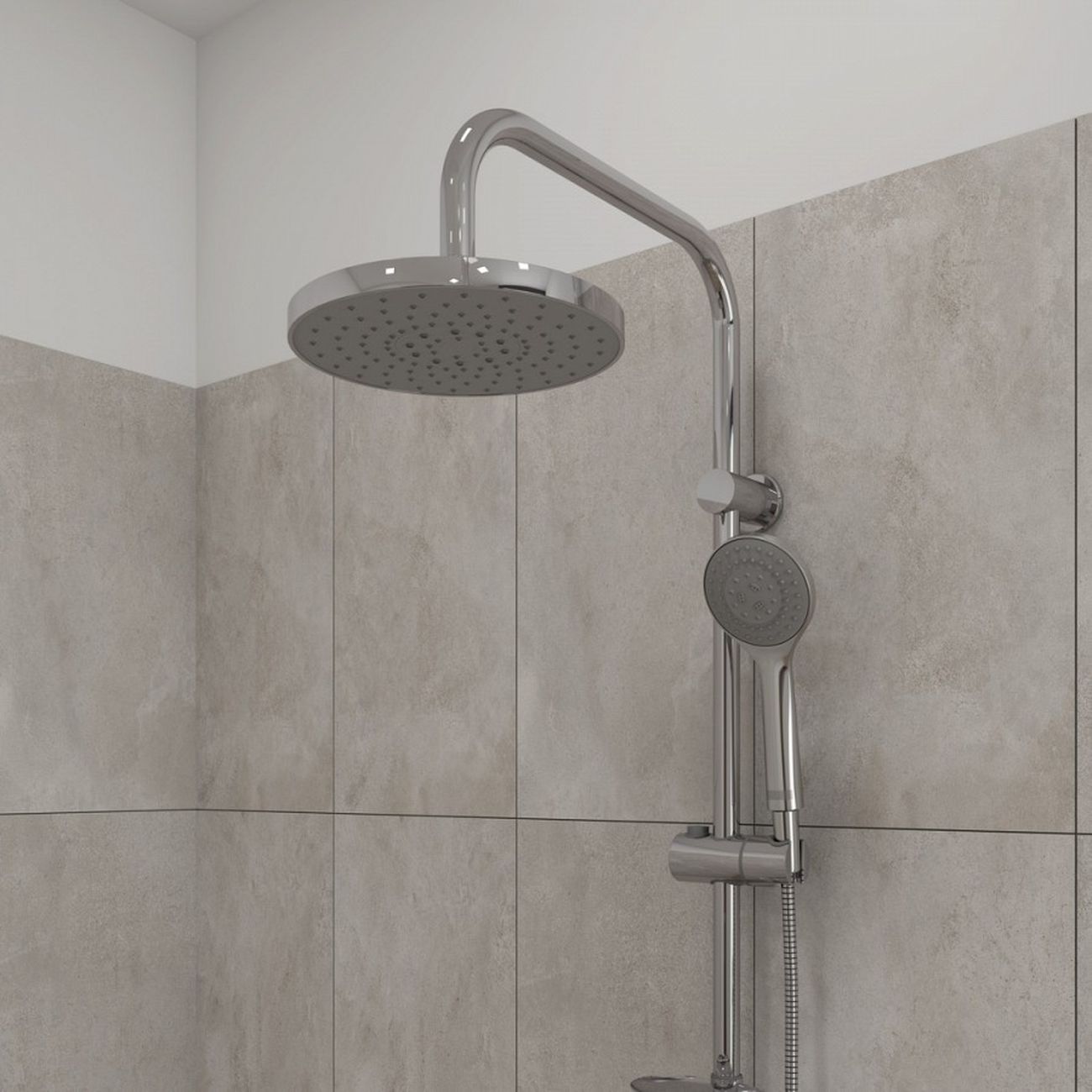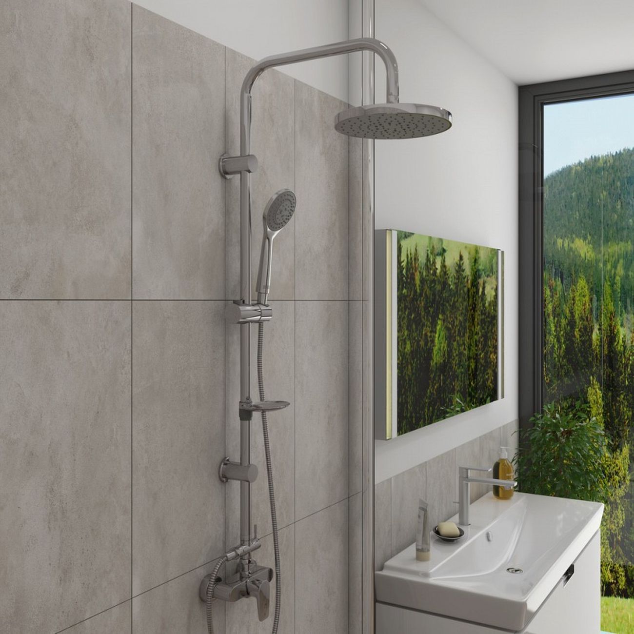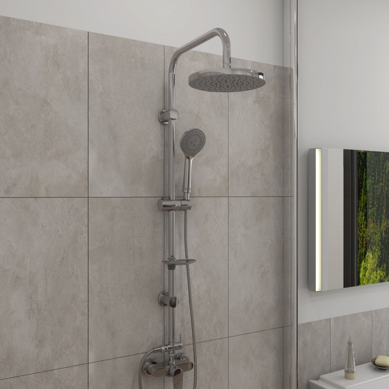 Душевая система Teymi Solli с тропическим душем T10203, выполненная в современном минималистичном дизайне, - идеальное решение для вашей ванной комнаты. Душевая система в глянцевом цвете хром лаконично впишется в дизайн интерьера и универсальна для установки как в душевой, так и в ванной. Душ имеет две лейки - большую верхнюю, создающую эффект тропического дождя, и классическую лейку с гибким шлангом. Угол наклона держателя ручной лейки можно регулировать. Ручная лейка имеет три режима работы. Надежная конфигурация душевой системы гарантирует максимально долгий срок эксплуатации устройства. Лейки верхнего и ручного душа имеют функцию легкой очистки от известковых отложений. ВНИМАНИЕ! Товар продается без смесителя. Смеситель приобретается дополнительно. Размеры изделия 25 х 37.5 х 100 см.