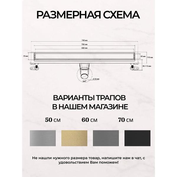 Линейный трап для душа BAS 700 мм с комбинированным поворотным гидрозатвором 360° (цвет — брашированная сталь). Современное решение для эффективного отвода воды в душевых с максимальной гигиеной и комфортом от надёжного производителя BAS. Корпус трапа выполнен из высокопрочной оцинкованной стали, обеспечивающей долговечность и устойчивость к механическим воздействиям. Решётка под плитку изготовлена из нержавеющей стали в цвете брашированной стали, что гарантирует отличные антикоррозийные свойства и стильный внешний вид. Комбинированный поворотный гидрозатвор (360°) с фильтром «сухой и влажный» надежно защищает от обратного потока воды и неприятных запахов. Скрытый монтаж под плитку гарантирует элегантный и лаконичный интерьер без лишних деталей на поверхности пола. Высокая пропускная способность 35-40 л/мин обеспечивает эффективный слив без образования луж и застойных зон с водой. В комплекте — сеточка для волос и мусора, которая сохраняет слив от засоров и облегчает уход. Удобная регулировка ножек облегчает установку и выравнивание трапа под нужный уровень. Металлический душевой трап BAS – это качество, надёжность и современный дизайн для вашего комфорта.