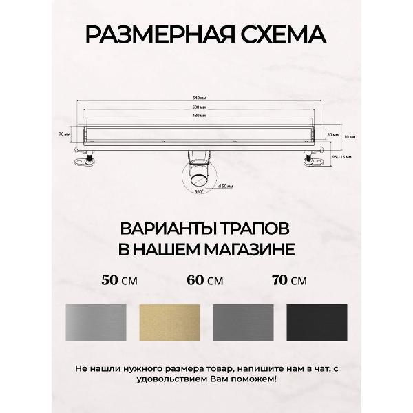 Линейный трап для душа BAS 500 мм с комбинированным поворотным гидрозатвором 360° (цвет — брашированное золото). Современное решение для эффективного отвода воды в душевых с максимальной гигиеной и комфортом от надёжного производителя BAS. Корпус трапа выполнен из высокопрочной оцинкованной стали, обеспечивающей долговечность и устойчивость к механическим воздействиям. Решётка под плитку изготовлена из нержавеющей стали в цвете брашированного золота, что гарантирует отличные антикоррозийные свойства и стильный внешний вид. Комбинированный поворотный гидрозатвор (360°) с фильтром «сухой и влажный» надежно защищает от обратного потока воды и неприятных запахов. Скрытый монтаж под плитку гарантирует элегантный и лаконичный интерьер без лишних деталей на поверхности пола. Высокая пропускная способность 35-40 л/мин обеспечивает эффективный слив без образования луж и застойных зон с водой. В комплекте — сеточка для волос и мусора, которая сохраняет слив от засоров и облегчает уход. Удобная регулировка ножек облегчает установку и выравнивание трапа под нужный уровень. Металлический душевой трап BAS – это качество, надёжность и современный дизайн для вашего комфорта.
