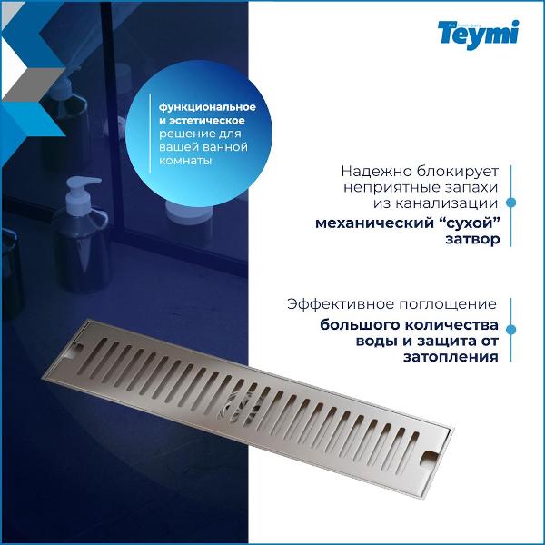 Душевой трап Teymi Helmi с сухим затвором – идеальное решение для обустройства современной душевой зоны. Модель Helmi T90329 размером 10х40 см объединяет инновационные технологии с практичностью, обеспечивая эффективный водоотвод и защиту от канализационных запахов. Стильная решетка из нержавеющей стали придает изделию элегантный внешний вид и гарантирует долговечность конструкции. Производитель предоставляет 5-летнюю гарантию на продукт, подтверждая его высокое качество. Ключевые преимущества модели: · Вертикальный выпуск с возможностью подключения 50 мм; · Оптимальная пропускная способность – 32 л/мин; · Механический сухой затвор предотвращает появление запахов; · Встроенная защита от попадания мусора в канализацию; · Работоспособность при температурах от -30° до +75°C; · Удобный монтаж; Трап под душевую кабину разработан специально для помещений с повышенной влажностью. Конструкция лотка обеспечивает быстрый отвод большого объема воды, исключая риск затопления. Материал устойчив к воздействию бытовой химии, что позволяет использовать различные чистящие средства. Продукция Teymi – это надежное решение для водоотведения, высококачественные материалы, используемые при производстве, гарантируют длительную эксплуатацию без потери технических характеристик. Душевой трап Helmi станет надежным функциональным элементом вашей ванной комнаты.