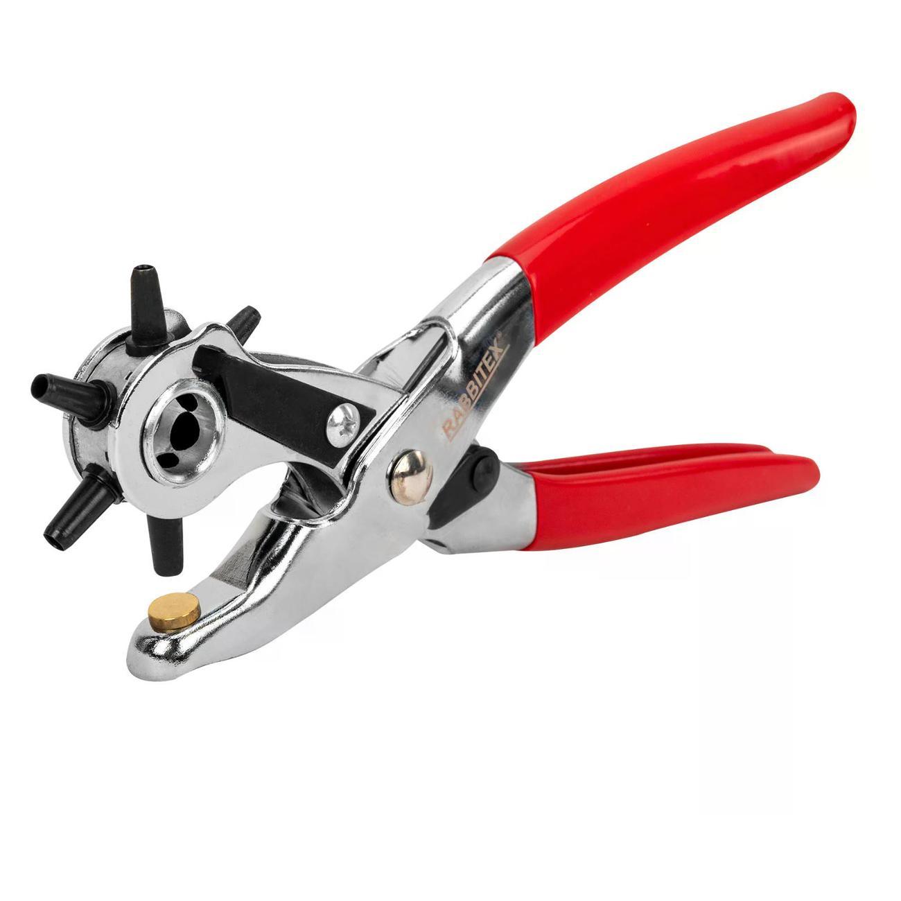 Дырокол-пробойник RABBITEX предназначен для пробивания отверстий в нетвердых материалах небольшой толщины – коже, кожзаме, ткани, картоне, пластике, резине. Изготовлен из высокопрочной углеродистой стали. Рукоятки покрыты нескользящим материалом ПВХ для максимального удобства и безопасности во время работы. Револьверный механизм с шестью пробойниками позволяет быстро выбрать нужный диаметр отверстия, надежно зафиксировав пробойник напротив латунной шайбы. Оснащен предохранителем для хранения в закрытом виде.