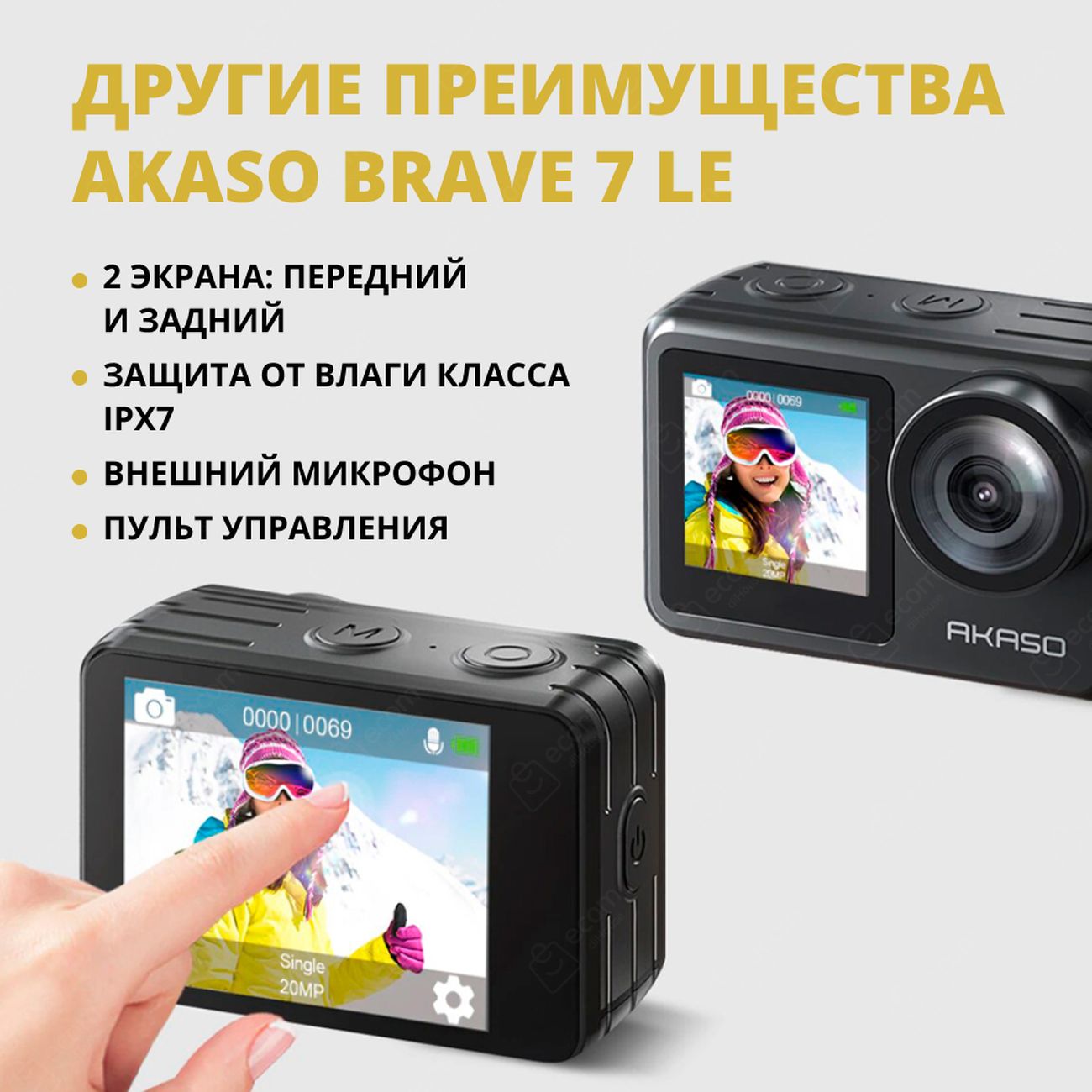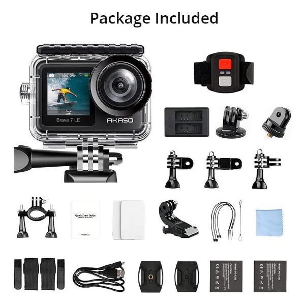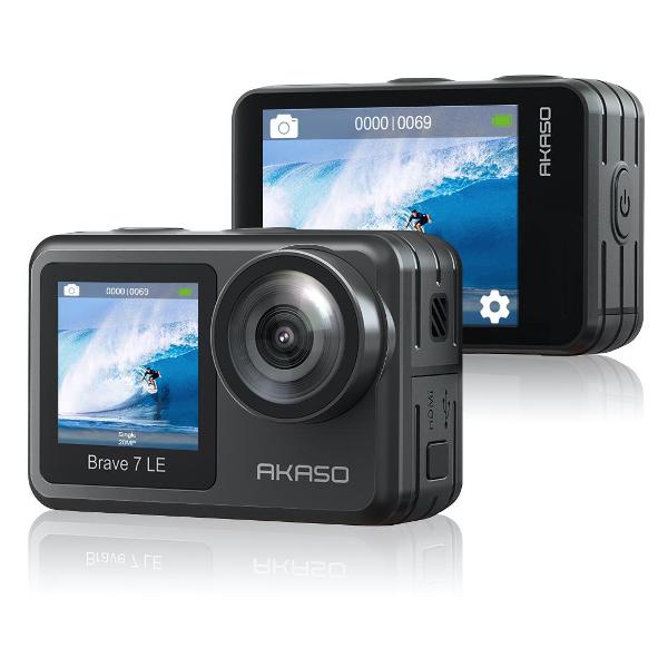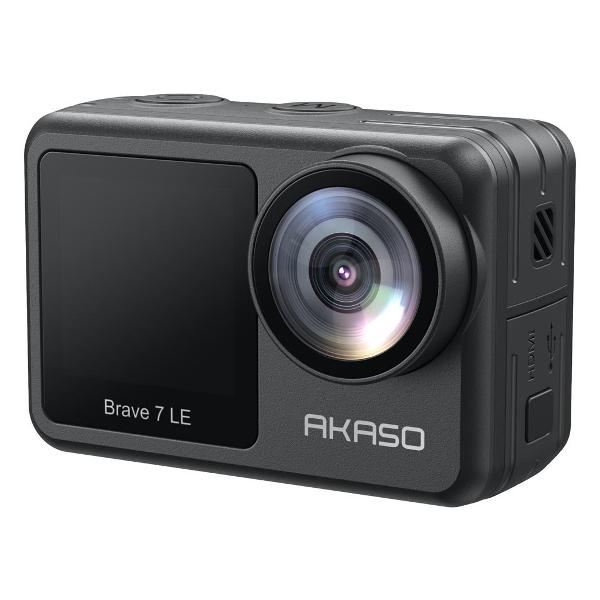 Экшн-камера Akaso Brave 7 LE выполнена в корпусе из прочного пластика. Класс водонепроницаемости — IPX7. На фронтальной части расположена широкоугольная линза с углом обзора 170°. Управление устройством производится при помощи механической кнопки. В основе работы лежит CMOS-матрица на 20 Мп, которая позволяет вести съемку с частотой 30 кадр/сек. Стабилизатор изображения цифрового типа уменьшает вероятность смазывания картинки при перемещении камеры. Интегрированный микрофон предназначен для записи звука. Динамики выдают громкое звучание.