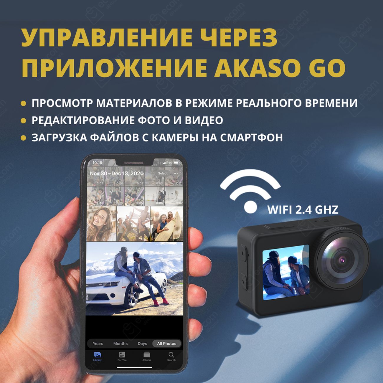 Экшн-камера функционирует от литий-ионной батареи емкостью 1350 мА*ч, которая гарантирует работу в автономном режиме до 2 часов. Предусмотрена возможность сжатия картинки — JPEG, MPEG, AVI, H.264, H.265. В комплект входят водонепроницаемый кейс, быстросъемное крепление, фиксатор на шлем, руль велосипеда, кабель HDMI, кабель USB. Габаритные размеры модели — 60х42х32 мм, вес — 43 г.