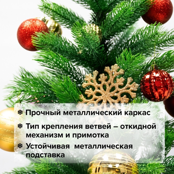 Искусственная ель «Золотая сказка» Premium высотой 150 см оснащена металлической подставкой. Четыре ножки обеспечивают устойчивое положение елки на поверхности. Ствол вставляется в верхний край подставки. Иголки хвои короткие, их длина составляет 2,5 см. Цвет — зеленый. Диаметр ели равен 81 см.