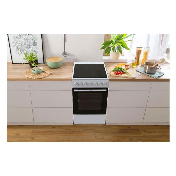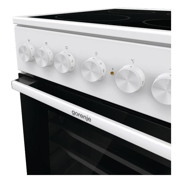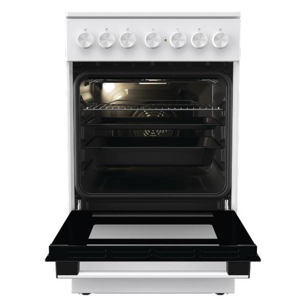 Электрическая плита Gorenje GEC5B41WG, белая — модель шириной 50 см, глубиной 59,4 см, высотой 85 см, что делает ее удачным выбором для небольших кухонь. На варочной поверхности — четыре конфорки типа Hi-Light: две диаметром 14,5 см мощностью 1,2 кВт и две диаметром 18 см и мощностью 1,7 кВт. Предусмотрены индикаторы остаточного тепла.