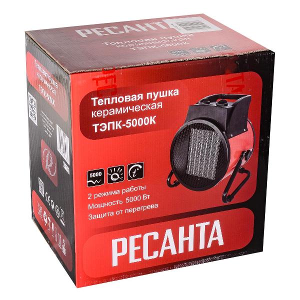 Электрическая тепловая пушка «Ресанта» ТЭПК-5000K (67/1/25) габаритами 35,8х26,2х34,3 см весит 4,3 кг.