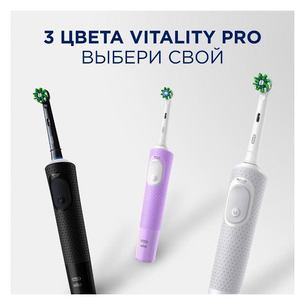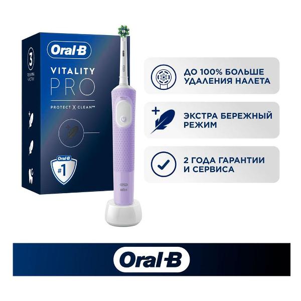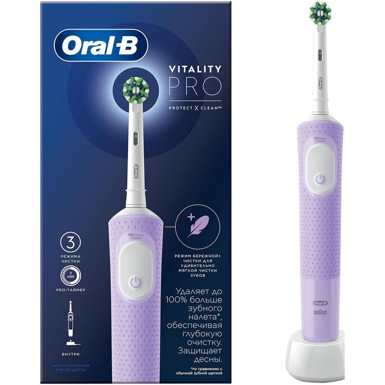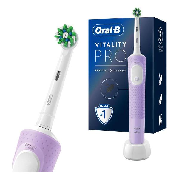 Электрическая зубная щетка Oral-B Vitality Pro D103.413.3 Lilac Mist произведена на основе технологии 2D-чистки. Скорость вращательно-поступательных движений головки составляет 7600 в минуту. Корпус зубной щетки сделан из пластика. На нем располагается световая индикация включения.