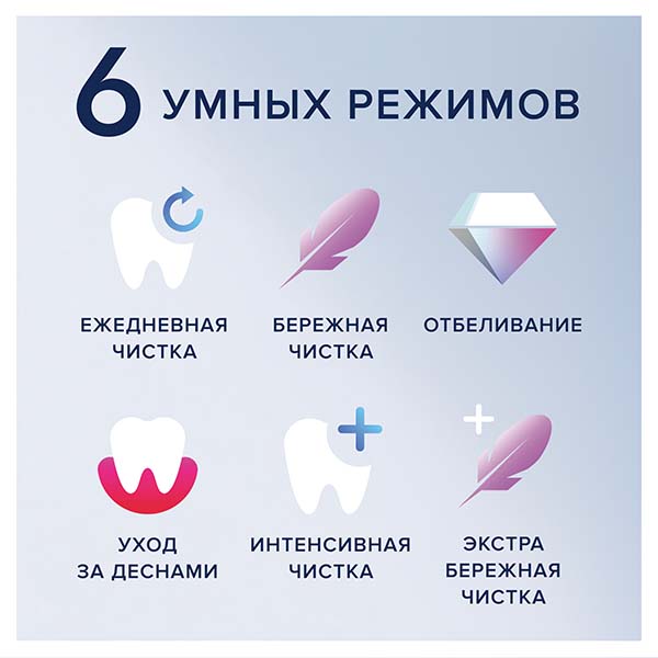 В этой модели реализована инновационная магнитная технология: вибрация передаётся каждой щетинке, что обеспечивает нежное и глубокое очищение каждого зуба. Из пяти интеллектуальных программ (ежедневная, чувствительная, защита дёсен, глубокая, отбеливание) вы без труда подберёте наиболее эффективную для себя.