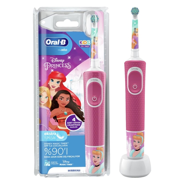 Щетинки на насадке используются как индикатор. В случае обесцвечивания ворса рекомендуется сменить насадку. Никель-металлогидридный аккумулятор обеспечивает работу в автономном режиме до 32 минут. Зубная щетка устанавливается на стол в вертикальном положении. В комплект входят зарядное устройство, четыре стикера с принцессами. Вес модели — 104 г.