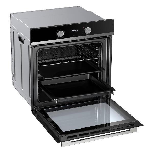 Модель оснащена сенсорной панелью управления, галогеновым освещением внутри, встроенными часами и таймером со звуковым сигналом. В набор входят металлическая решетка, плоский и глубокий противни, решетка для гриля. Класс энергоэффективности — A.