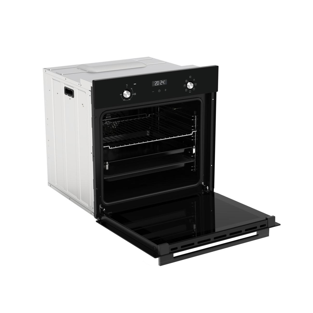 Haier HOX-P06HGB — электрический духовой шкаф объемом 76 л, встраиваемый в нишу 59,5х59,5х56,7 см. Модель черного цвета с серебристой фурнитурой оснащена стеклянной панелью управления с сенсорными кнопками и утапливаемыми поворотными переключателями.