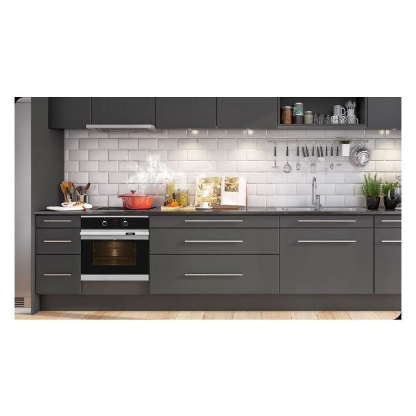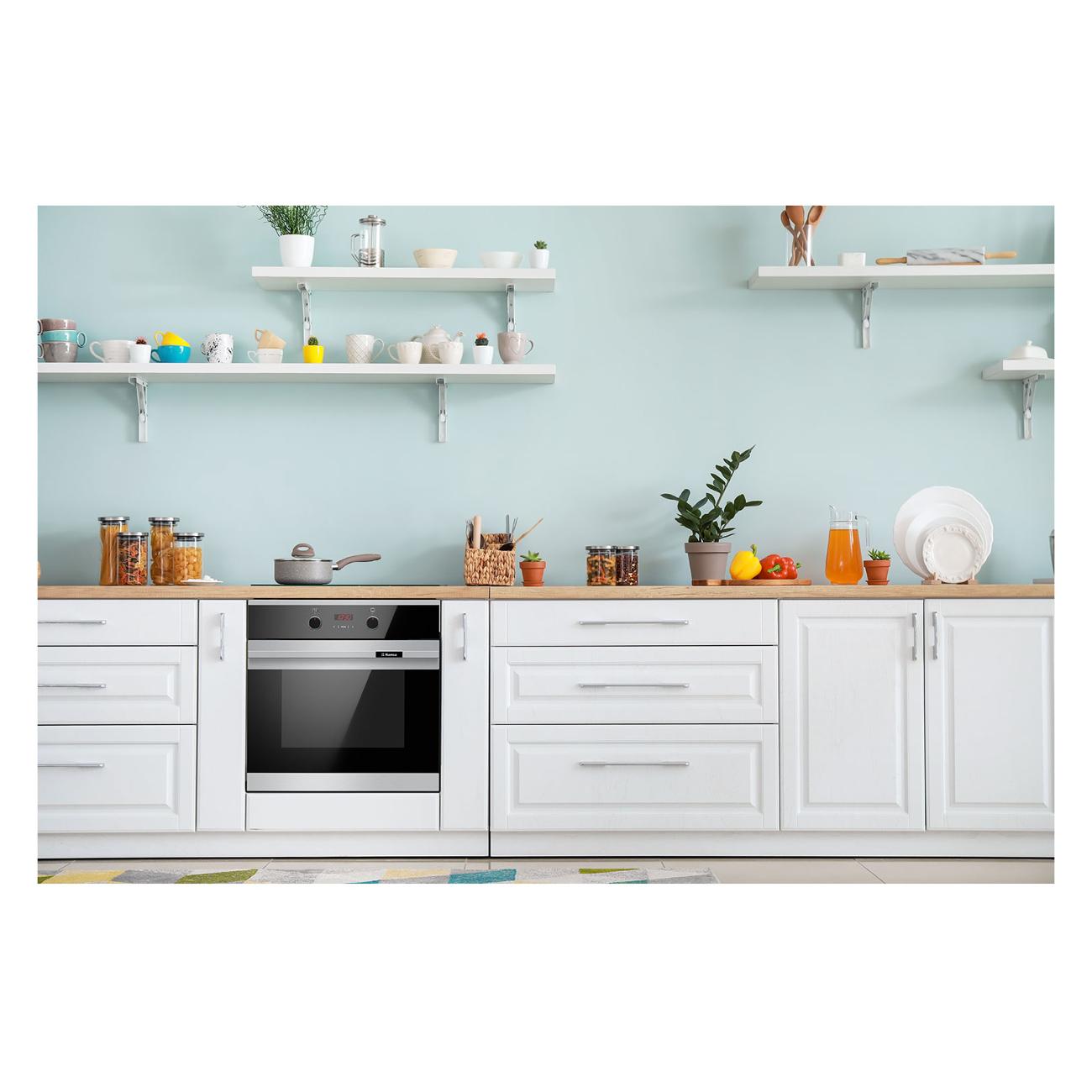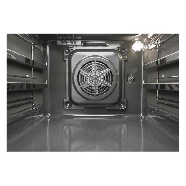 У модели есть 5-уровневые телескопические направляющие для противня. Яркая подсветка помогает контролировать процесс приготовления блюда. Режим конвекции позволяет продуктам равномерно пропекаться под воздействием горячего потока воздуха. Есть функция «Очистка паром» и индикация режима работы. Управление механическое. Все настройки вносятся с помощью сенсорной панели и отображаются на цифровом дисплее. В комплекте поставляется металлическая решетка, по одному глубокому и плоскому противню. Габариты: 59,5х59,5х57,5 см. Вес прибора — 28,75 кг.