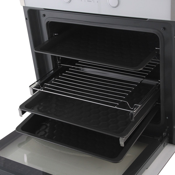 Достоинства: есть много режимов работы, хорошая комплектация (три противня), телескопические направляющие, позволяющие легко достать блюдо, а затем легко задвинуть обратно, равномерный прогрев, за счёт конвекции, на нескольких уровнях, термощуп для больших кусков мяса, очистка паром облегчает уход за шкафом, немаркая поверхность, минимальный нагрев переднего стекла (трёхслойная дверка).