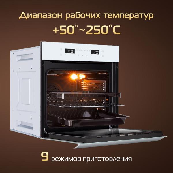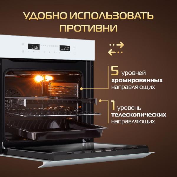 Электрический духовой шкаф Hiberg VM 6192 W предназначен для размораживания, выпечки и других функций. С помощью панели управления можно настроить температуру, время приготовления в соответствии с индивидуальными потребностями. Устройство оснащено цифровым дисплеем, на котором отображается информация о текущем режиме. За счет специального вентилятора обеспечивается равномерное распределение тепла. Для комфортной эксплуатации предусмотрена лампа накаливания, обеспечивающая качественное освещение внутри камеры, поэтому контролировать степень готовности блюда можно при закрытой дверце.