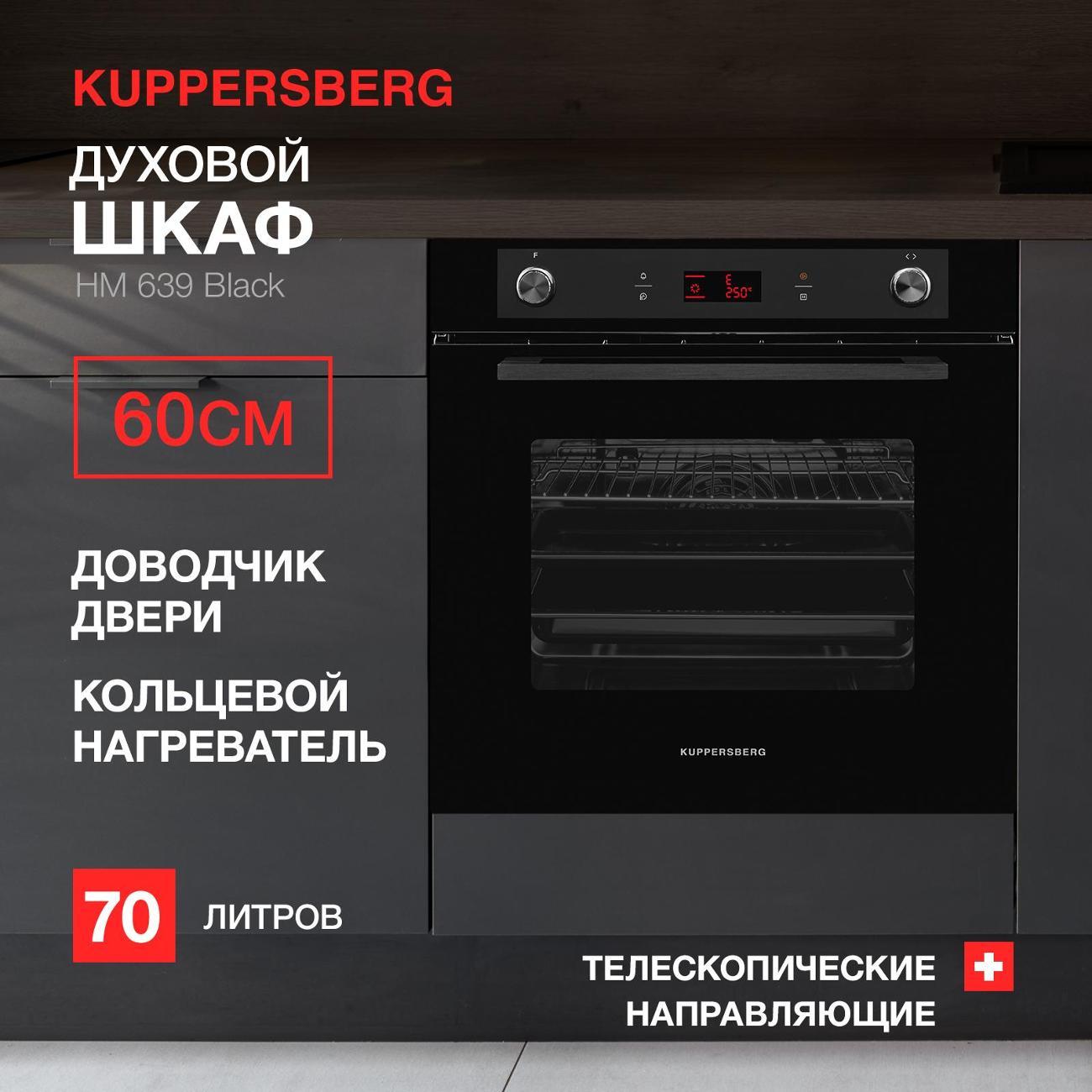 Электрический духовой шкаф Kuppersberg HM 639, цвет корпуса черный сконструирован для независимого монтажа в нишу размерами 600×560×570 мм. Мощность подключения — 3 кВт. Фасад прибора в стиле high-tech выполнен из закаленного стекла, оснащен откидной дверцей с доводчиком, горизонтальной ручкой и трехслойным остеклением, которое поддерживает технологию сохранения тепла в камере и снаружи нагревается до 25°С. Лампа подсветки обеспечивает хороший обзор всех уровней.