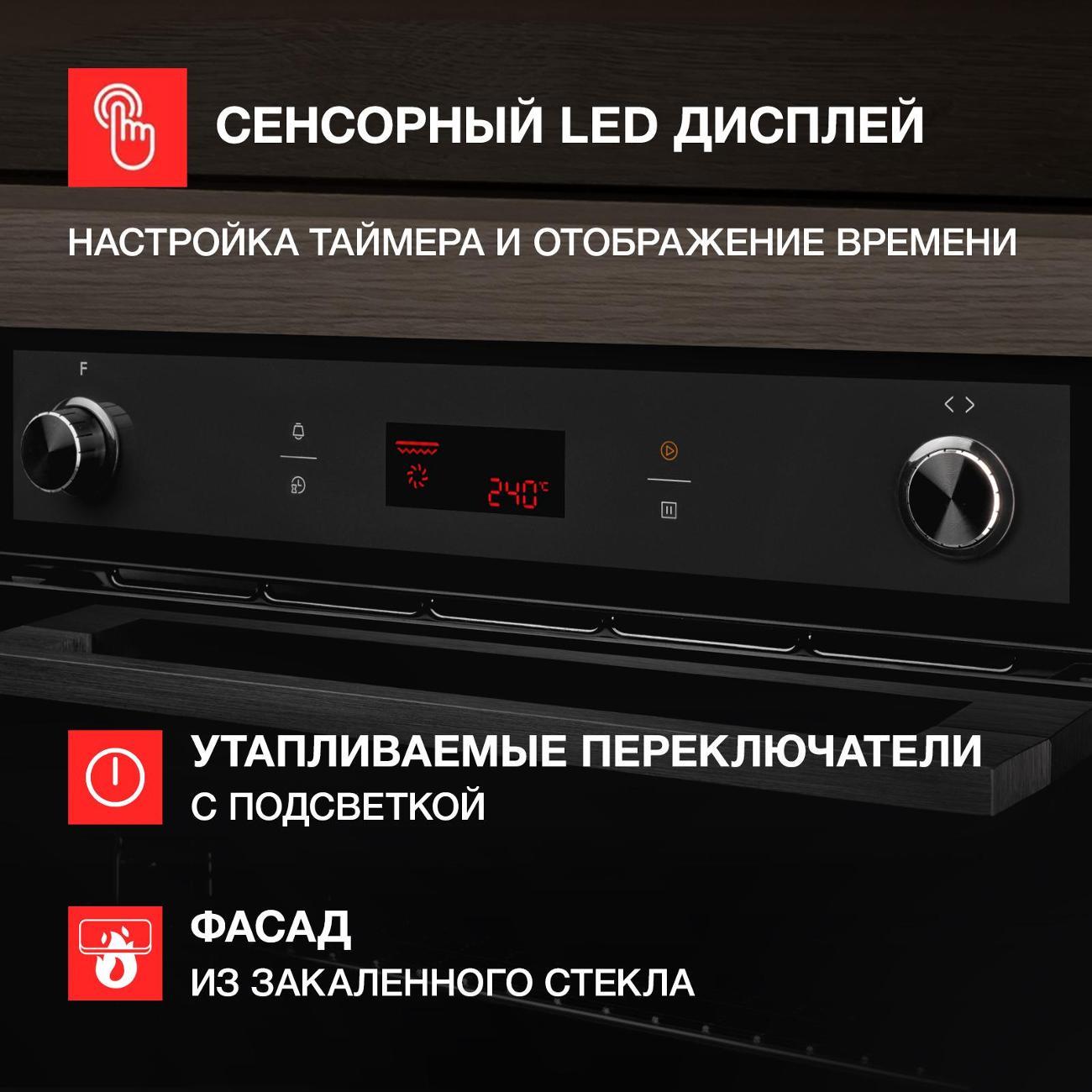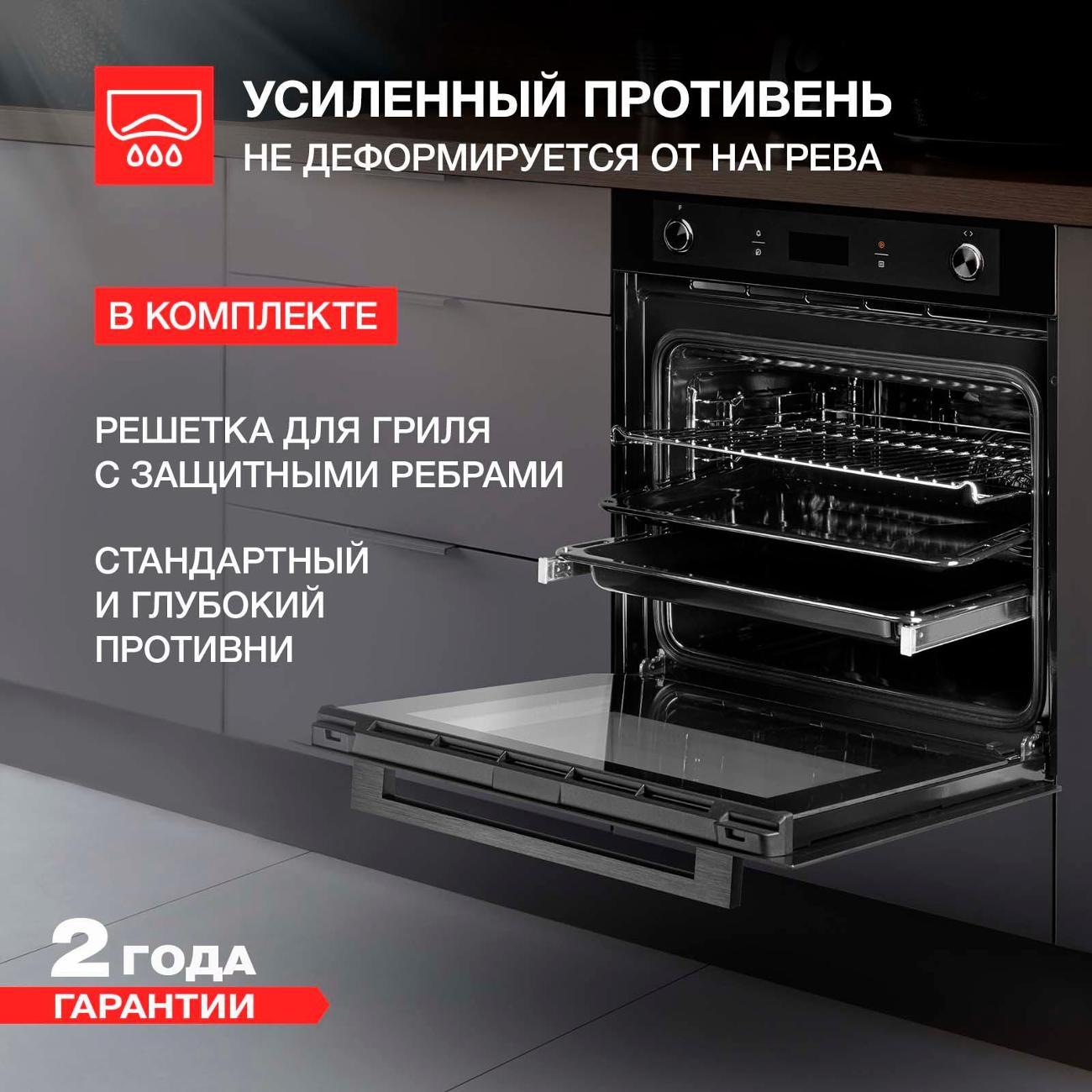 Духовой шкаф относится к классу энергоэффективности А. Для безопасной эксплуатации предусмотрена блокировка управляющей панели и автоматическое отключение при перегреве.