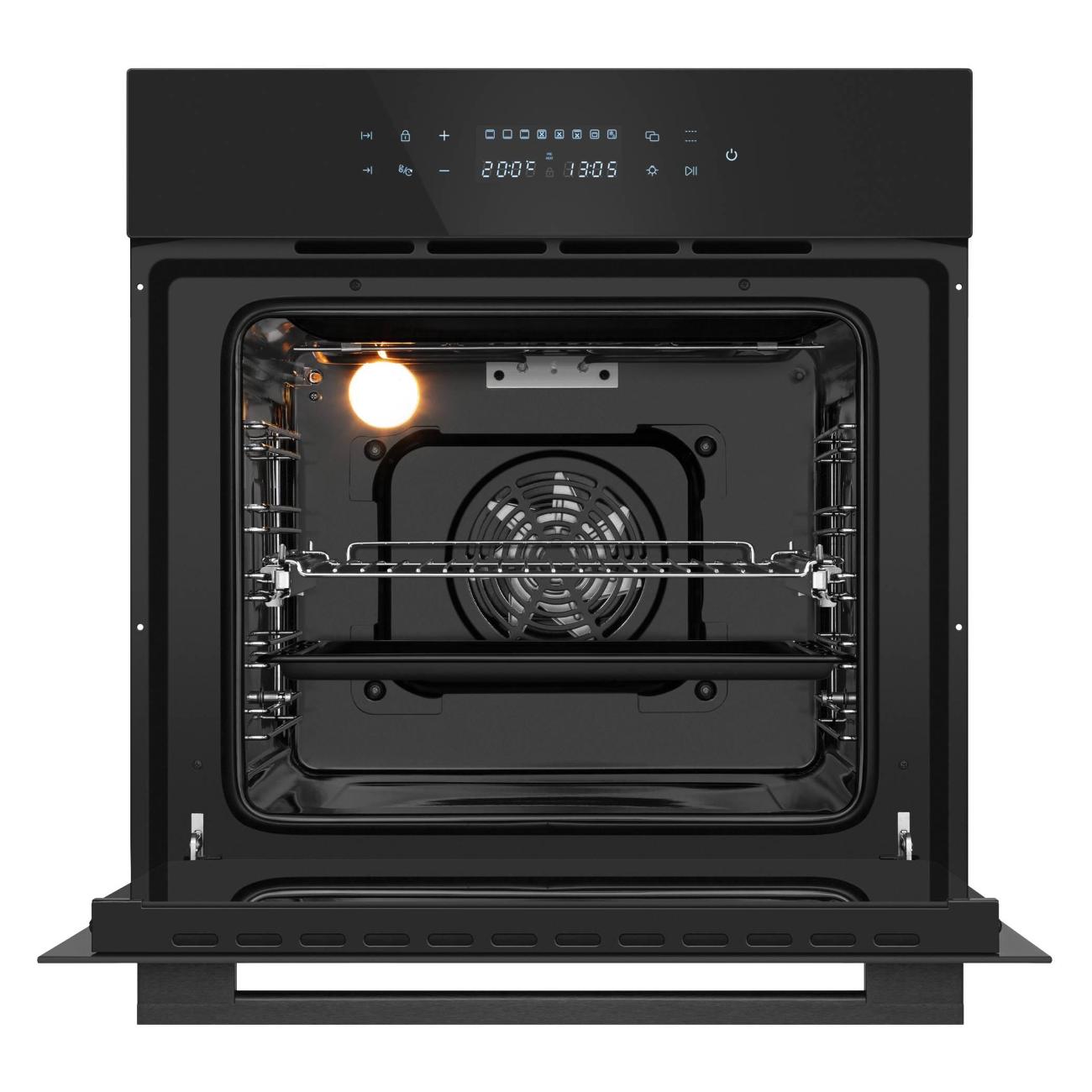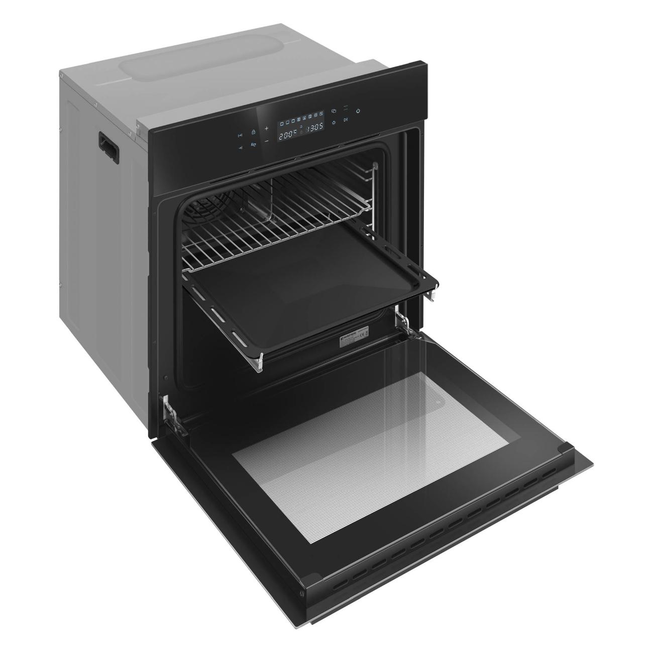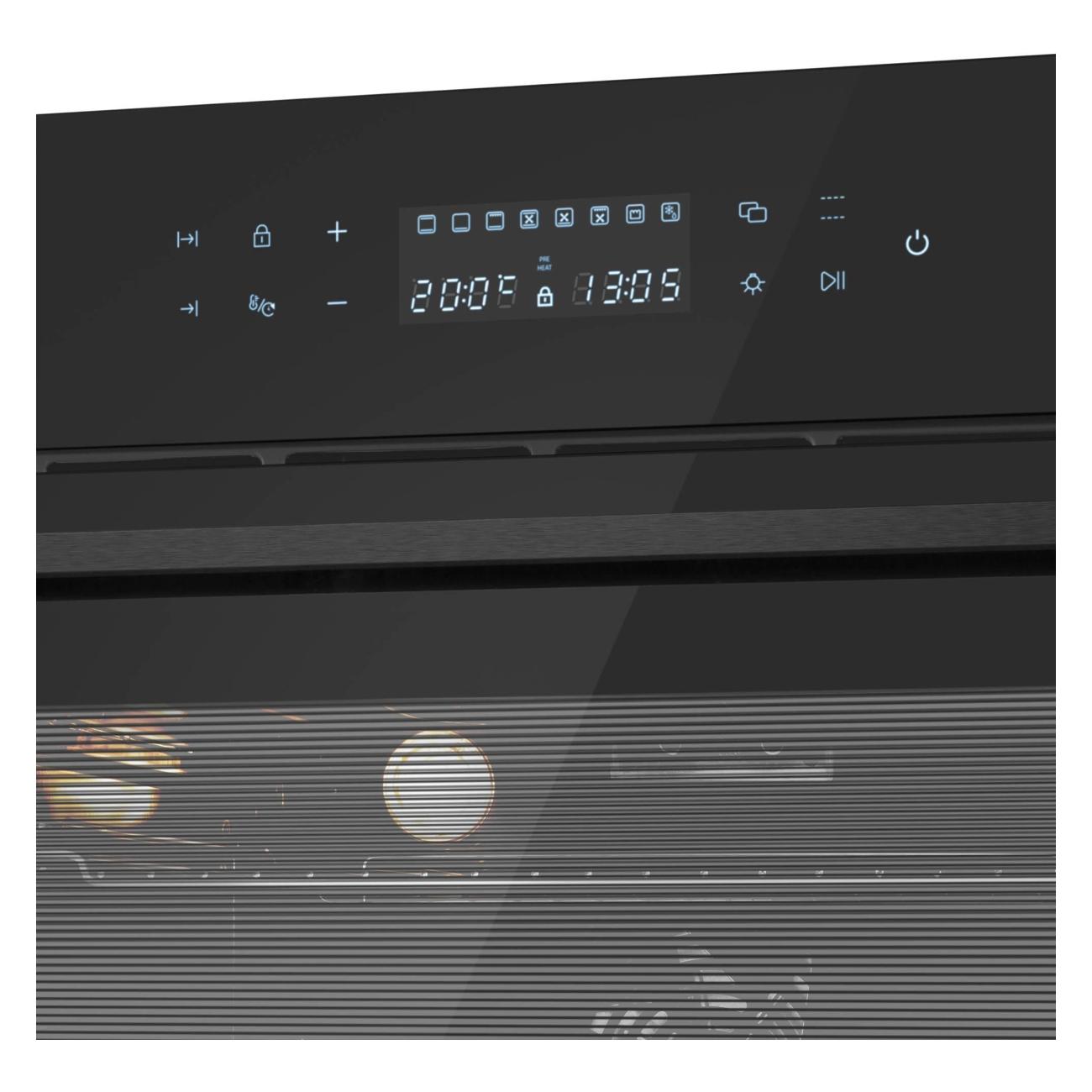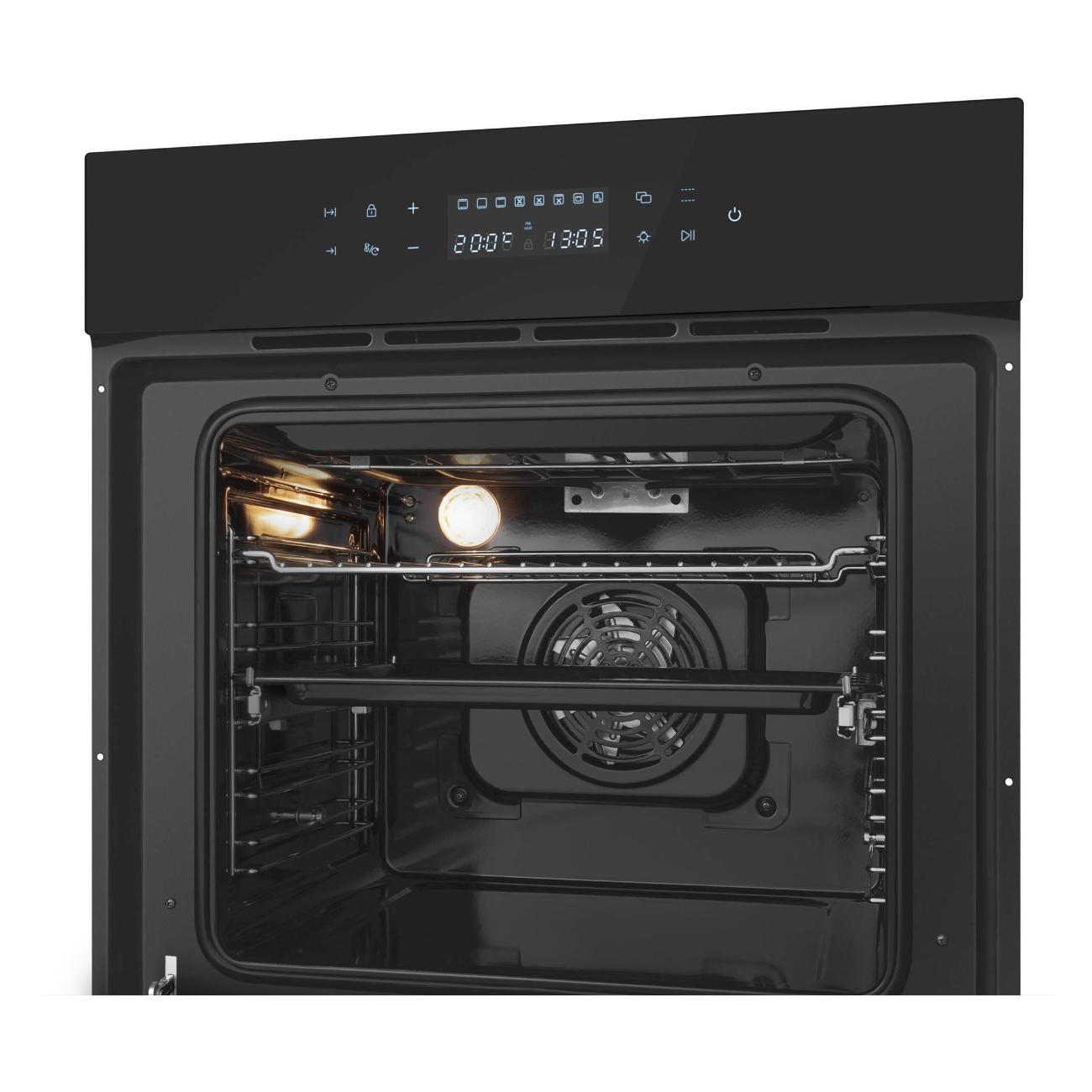 Модель размером 59,5х59,5х56,3 см обладает сенсорным интуитивно понятным управлением, что делает использование духового шкафа простым и удобным. Чтобы контролировать время, температуру и установленный режим, следует воспользоваться цифровым дисплеем. На случай непредвиденного нажатия клавиш рекомендуется использовать функцию защиты от детей. Корпус изготовлен из высокопрочного материала, который устойчив к перепадам температуры и механическим повреждениям.