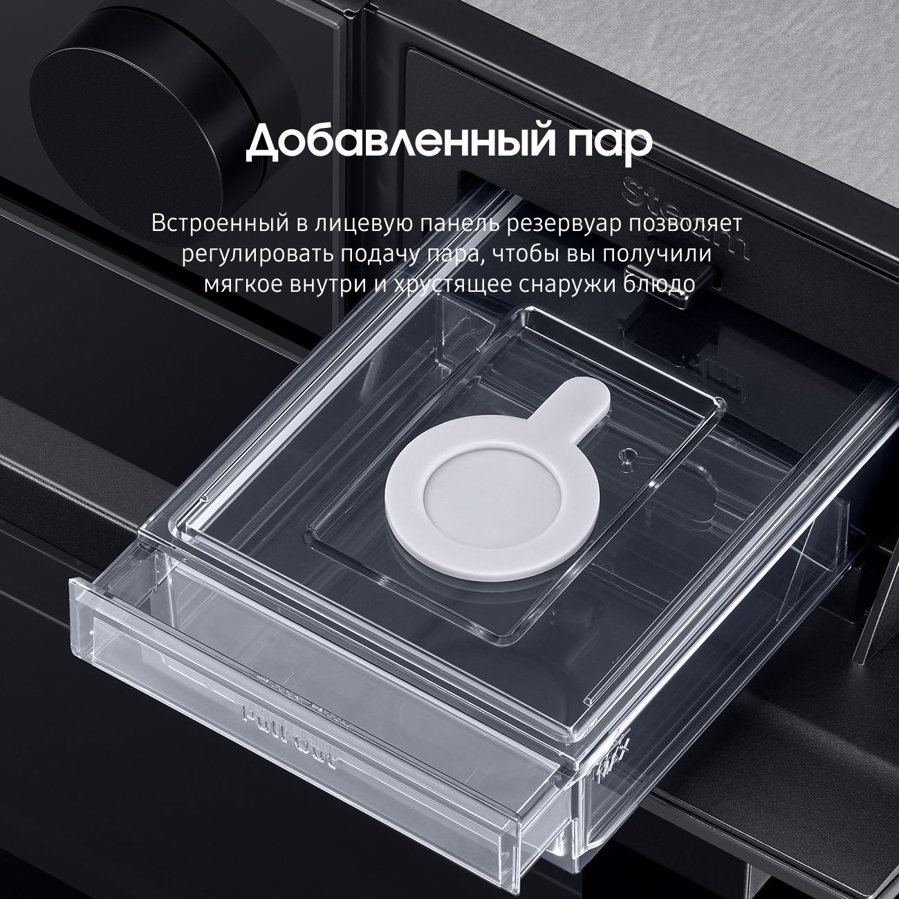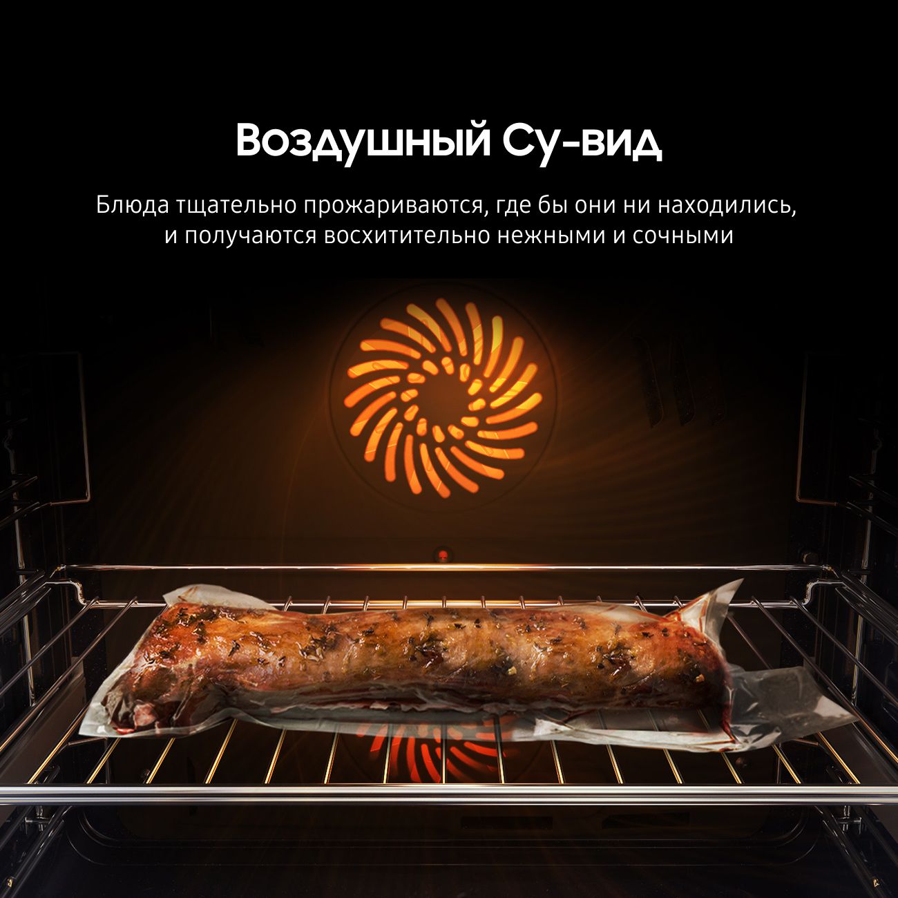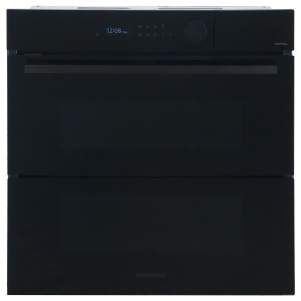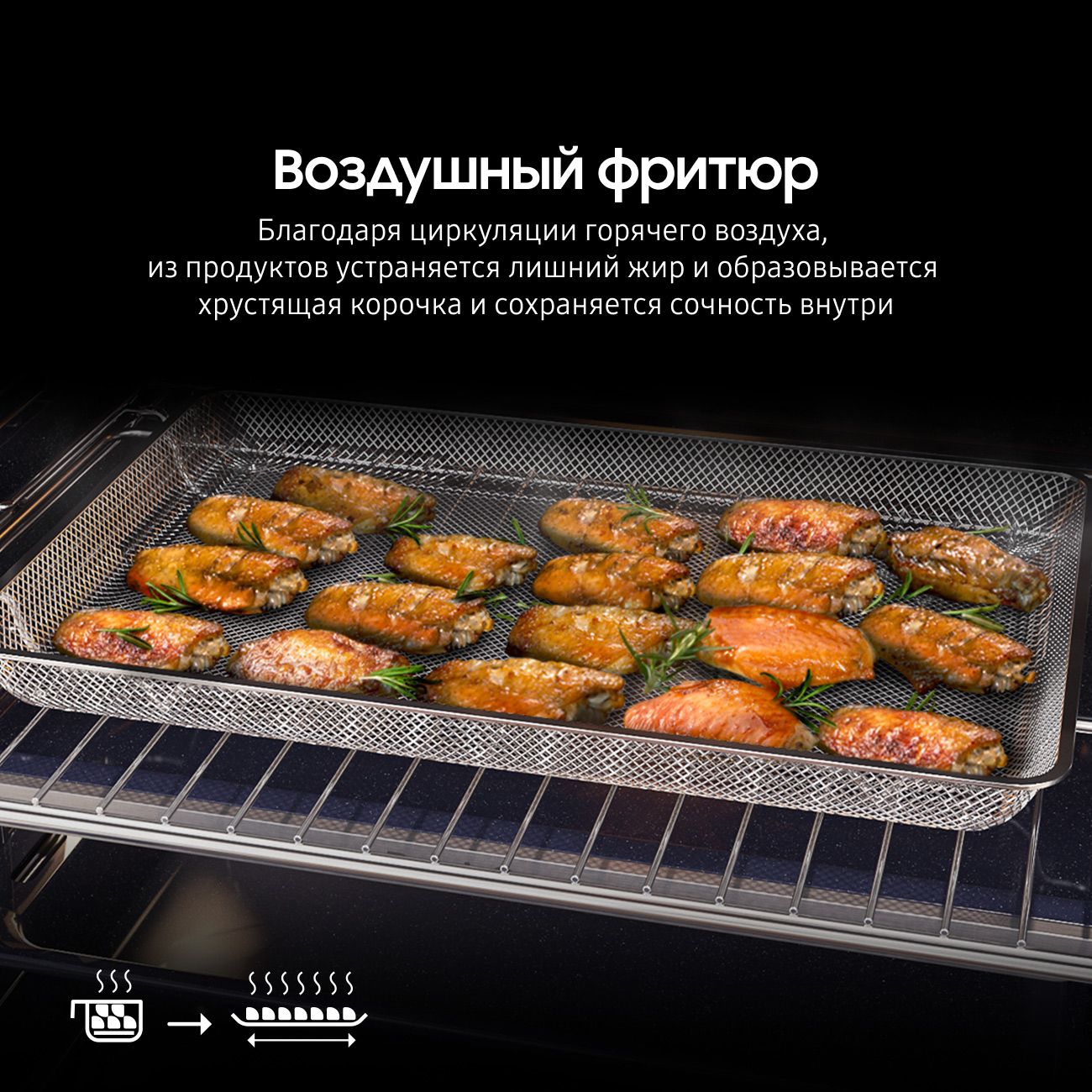 Камера объемом 76 л с галогенной подсветкой оборудована пятиуровневыми направляющими для противней. Технология Dual Cook позволяет готовить сразу два блюда, выбирая для них разную температуру и время приготовления. Наполовину откидная дверца открывает доступ только к верхней части духового шкафа (если блюдо готовится в верхней зоне). Блок управления включает сенсорный модуль с дисплеем для выбора времени, настройки температуры, и поворотный переключатель для подбора и установки режима. Предусмотрено управление работой с помощью мобильного приложения Smart Things Cooking.