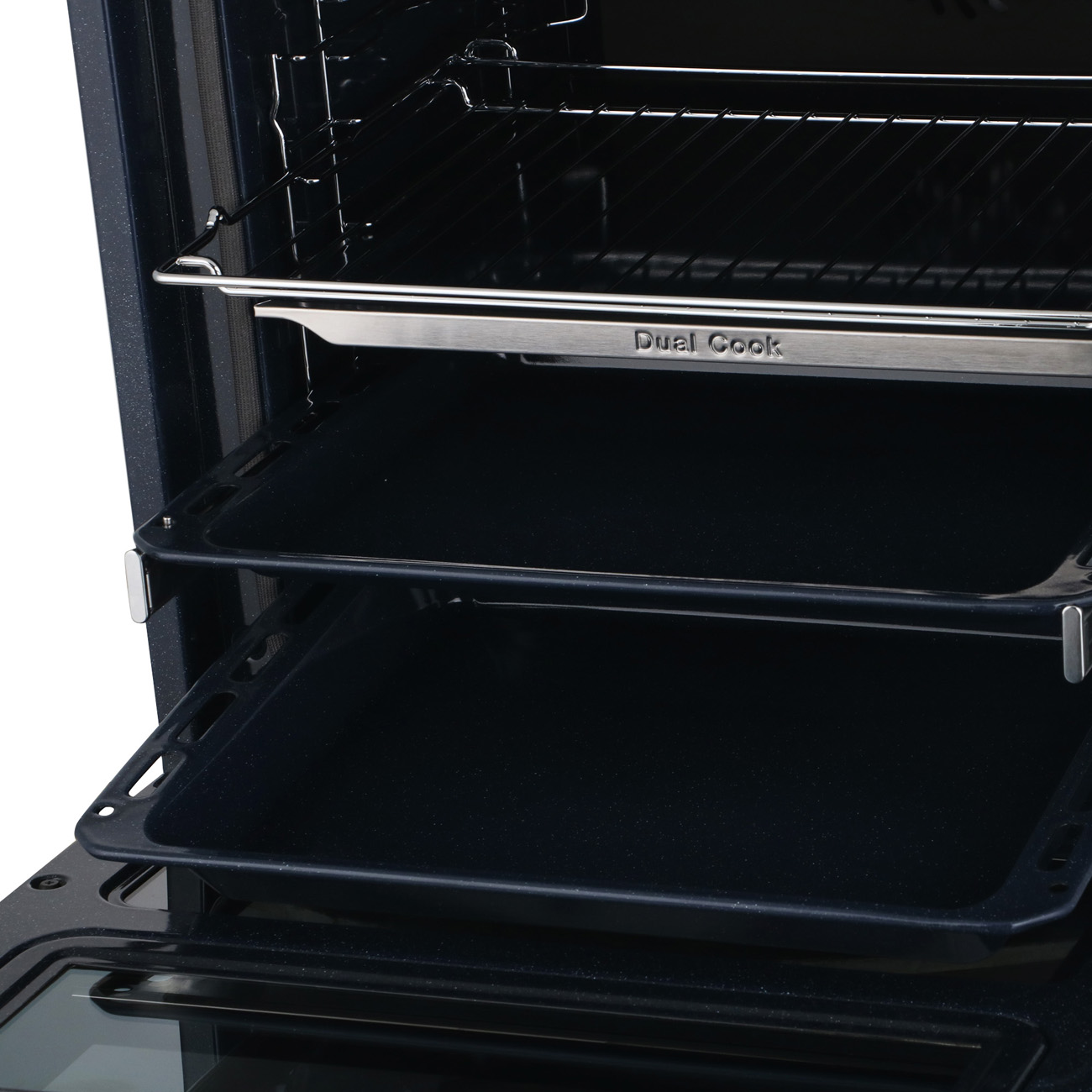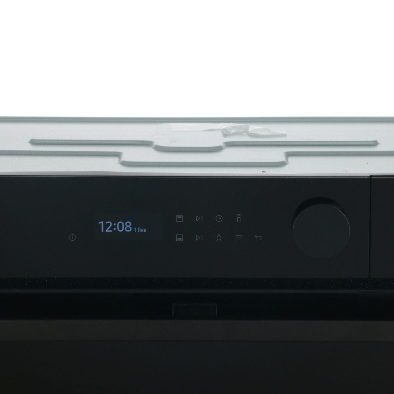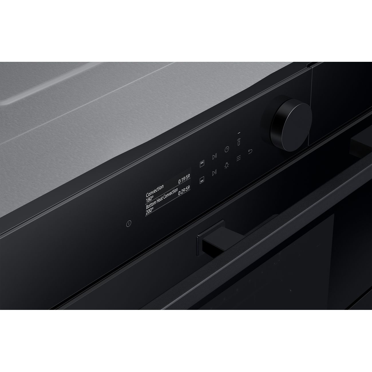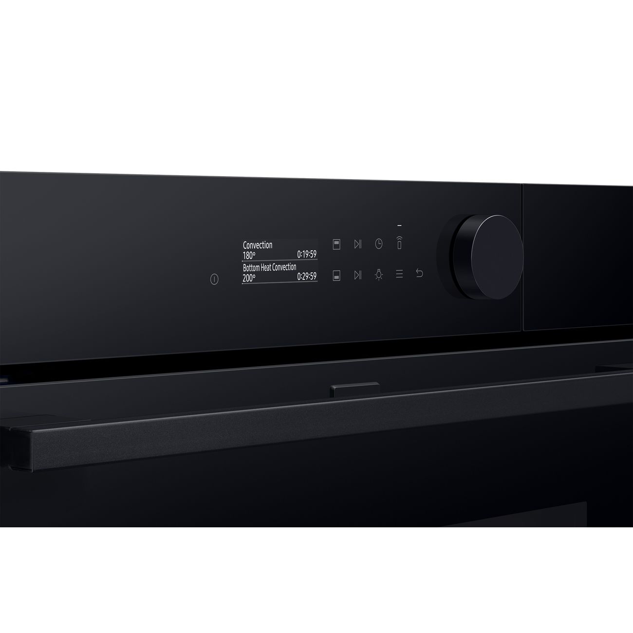 Камера объемом 76 л с галогенной подсветкой оборудована пятиуровневыми направляющими для противней. Технология Dual Cook позволяет готовить сразу два блюда, выбирая для них разную температуру и время приготовления. Наполовину откидная дверца открывает доступ только к верхней части духового шкафа (если блюдо готовится в верхней зоне). Блок управления включает сенсорный модуль с дисплеем для выбора времени, настройки температуры, и поворотный переключатель для подбора и установки режима. Предусмотрено управление работой с помощью мобильного приложения Smart Things Cooking.