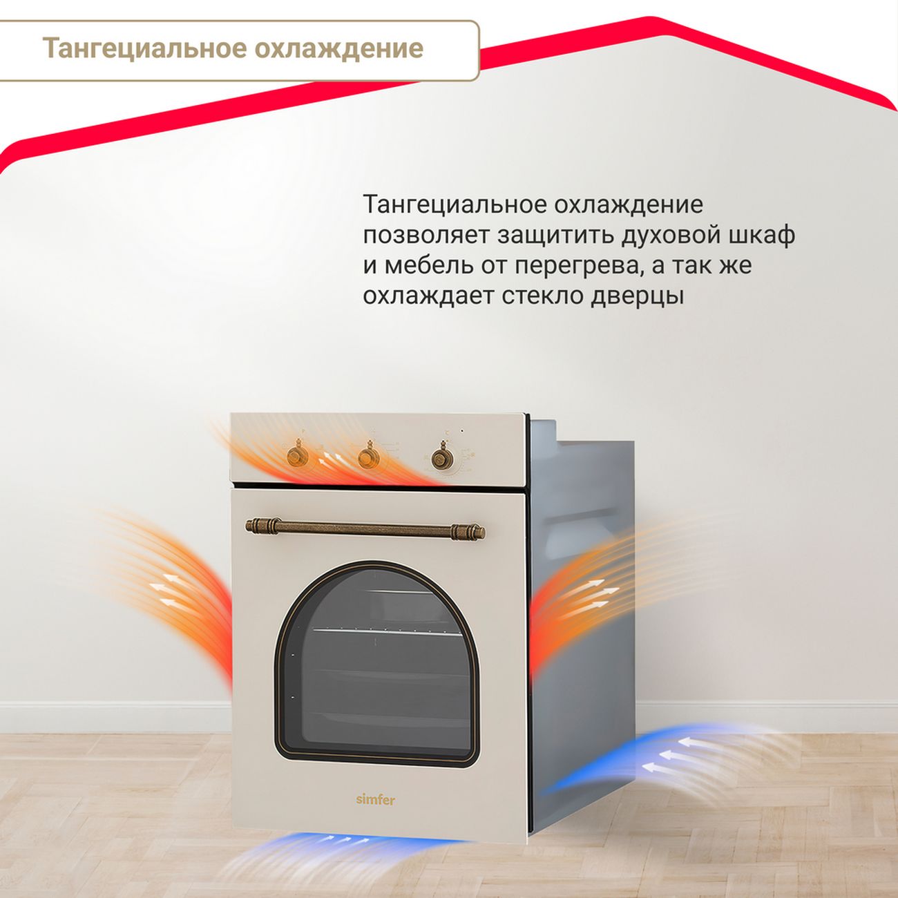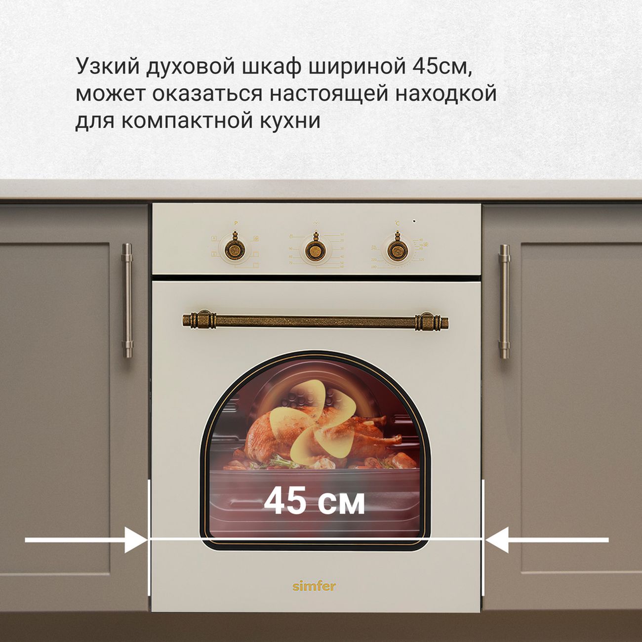 Встраиваемый электрический духовой шкаф Simfer B4EO16017 объемом 49 л предназначен для монтажа в нишу шириной 45 см. У модели весом 24 кг механическое управление. Корпус выполнен в ретростиле из термостойкого стекла бежевого цвета с бронзовой фурнитурой. Внутреннее покрытие — легко чистящая эмаль Easy clean. Дверца духового шкафа изготовлена из двухслойного съёмного стекла. Максимальная температура нагрева — +240°С, минимальная — +40°С. Тангенциальная система охлаждения не позволяет дверце духового шкафа нагреваться и защищает духовой шкаф и мебель от перегрева. Технология стекла дверцы Low-E сохраняет тепло внутри рабочей зоны. Пять режимов работы: «Верхний+Нижний», «Двухсторонний+Конвекция», «Нижний+Конвекция», «Верхний нагрев», «Очистка».