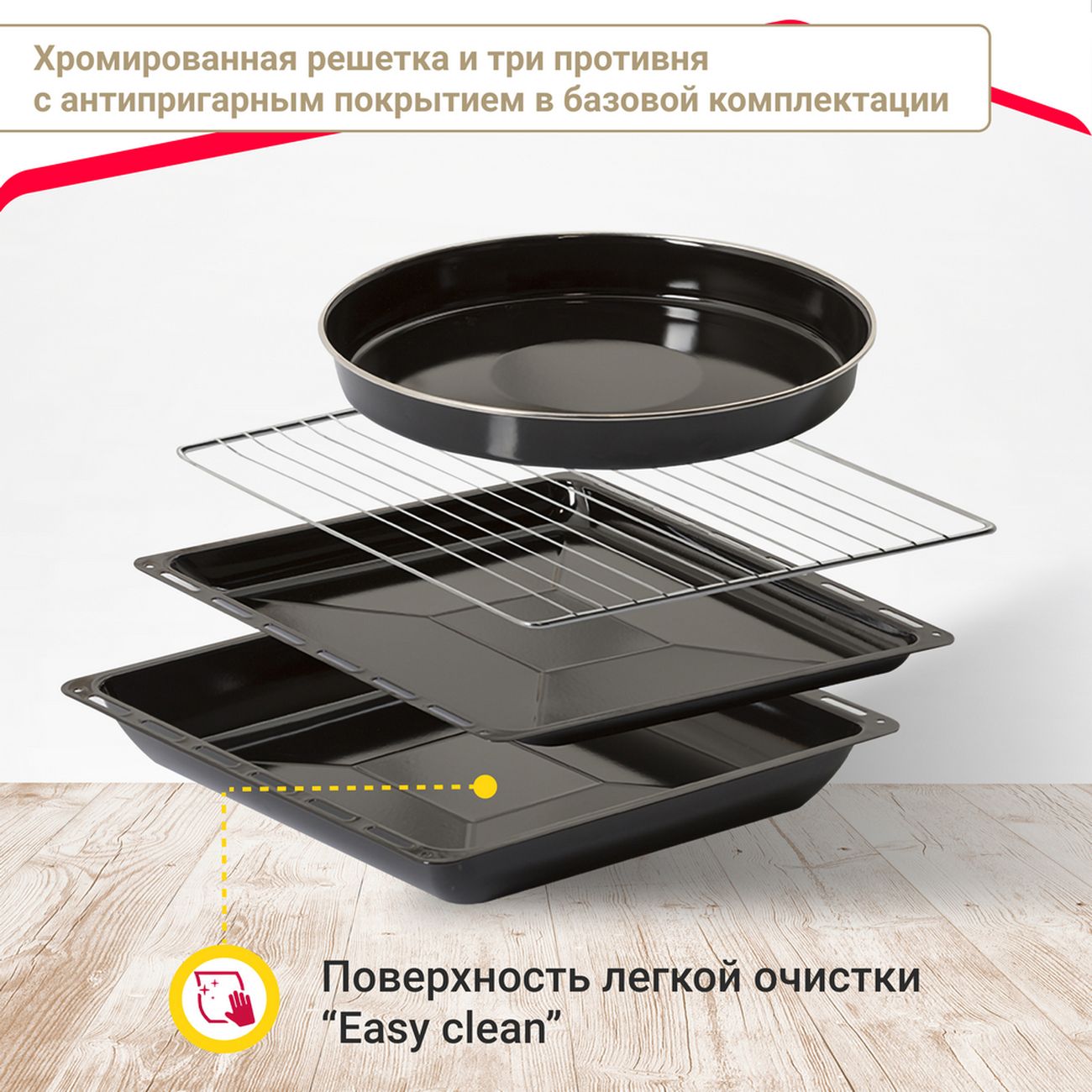В комплект входит три противня с покрытием легкой очистки: стандартный, круглый глубокий и стандартный глубокий. Металлическая решетка также в комплектации.