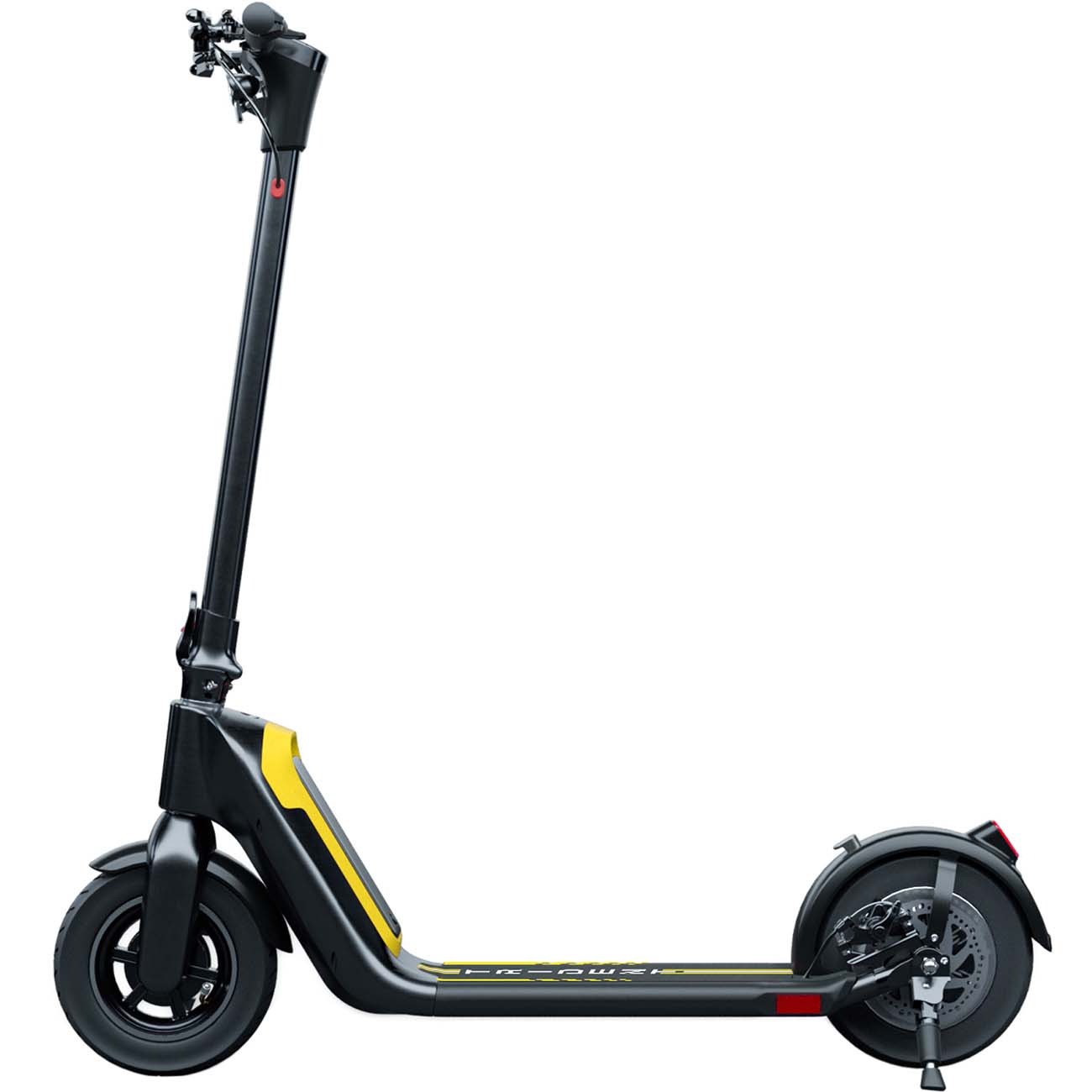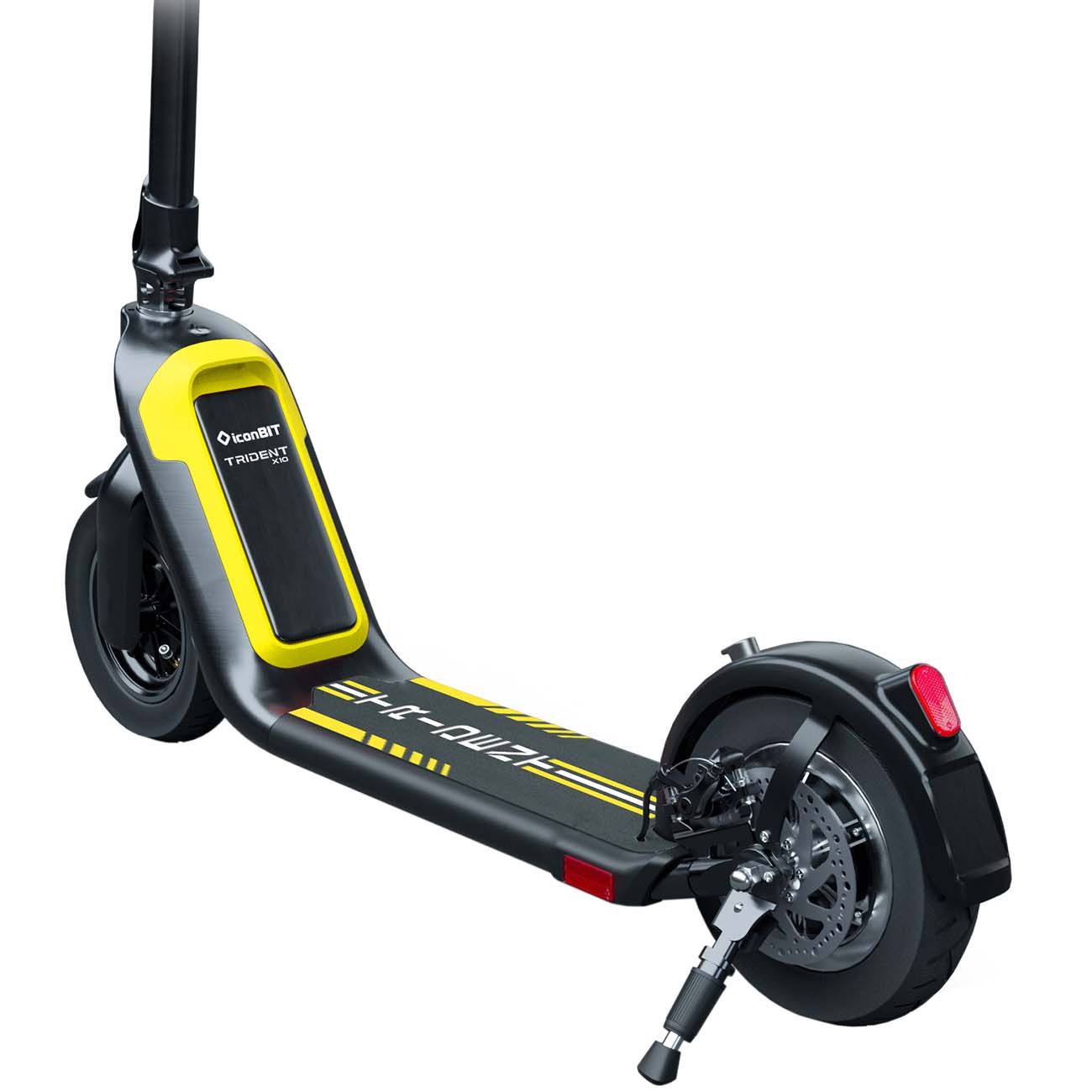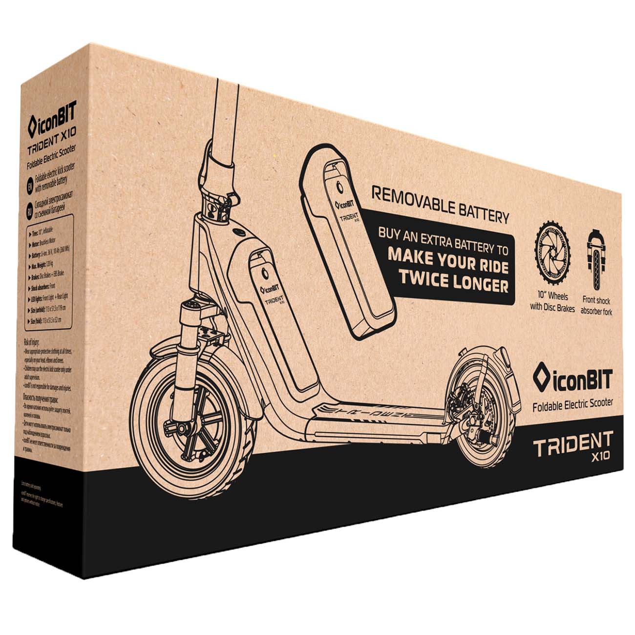 Электрический самокат iconBIT Trident X10 (IK-1970K) — универсальная модель с эффективным передним амортизатором и большими надувными колесами диаметром 25,4 см. Последние позволяют проще преодолевать бордюры небольшой высоты. Особенность конструкции заключается в том, что ее можно быстро сложить — важно для экономии места при хранении и упрощения транспортировки. Максимальная нагрузка, на которую рассчитан самокат, составляет 120 кг. Скорость движения — до 25 км/ч.