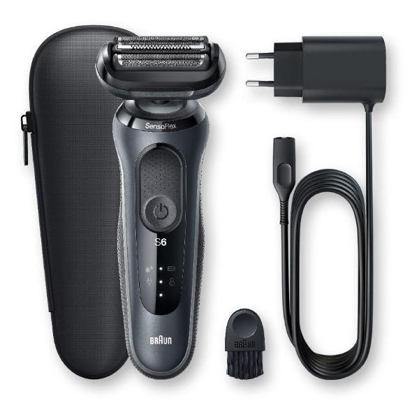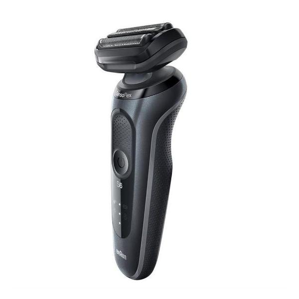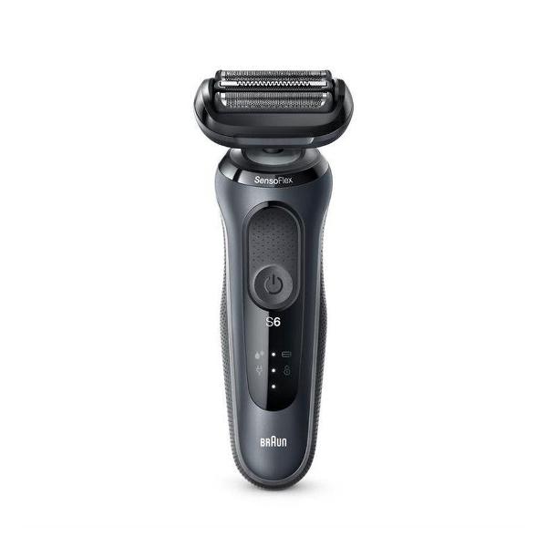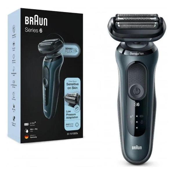 Электробритва Braun 61-N1000S в пластиковом корпусе черного цвета дополнена прорезиненными вставками, не позволяющими скользить в ладони. В нижней части располагается экран с индикацией, отображающей информацию об уровне оставшегося заряда, необходимости почистить лезвия. Круглая кнопка используется для включения устройства.
