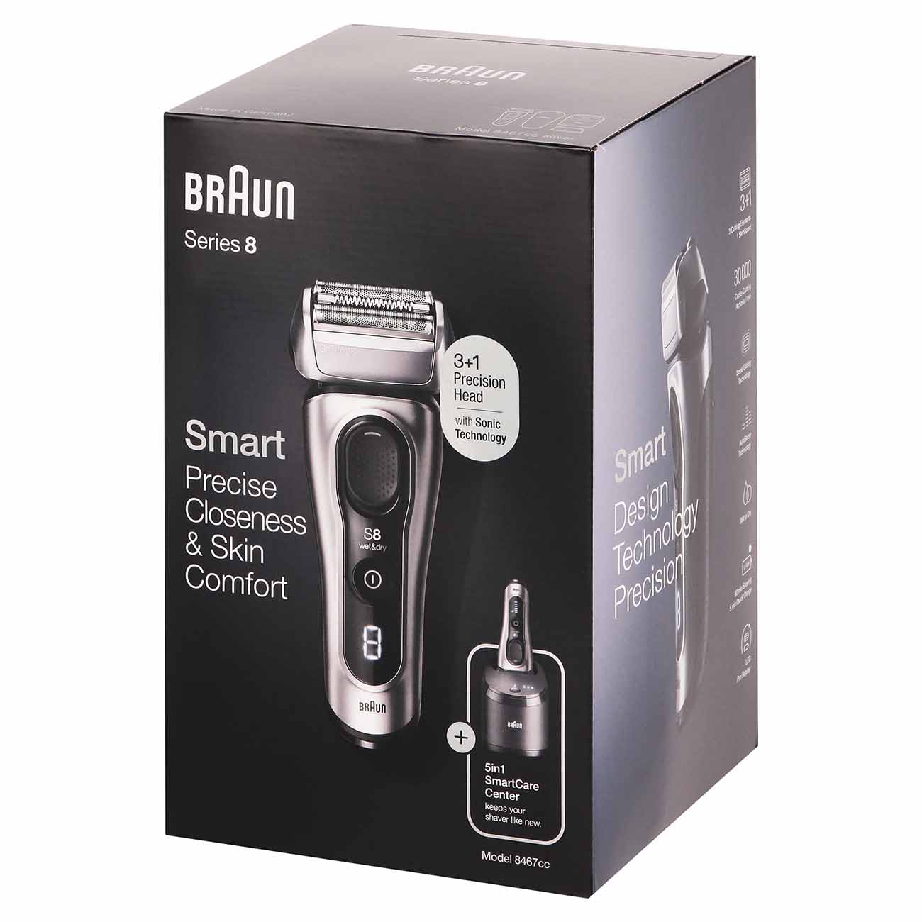 Мой супруг всю жизнь пользовался только бритвенными станками. Решила я приобщиться его к более технологичному виду бритья, а точнее - я подарила ему электробритву Braun 8467cc Silver. Купила именно эту модель по совету коллег-мужчин, которые её очень хвалили.