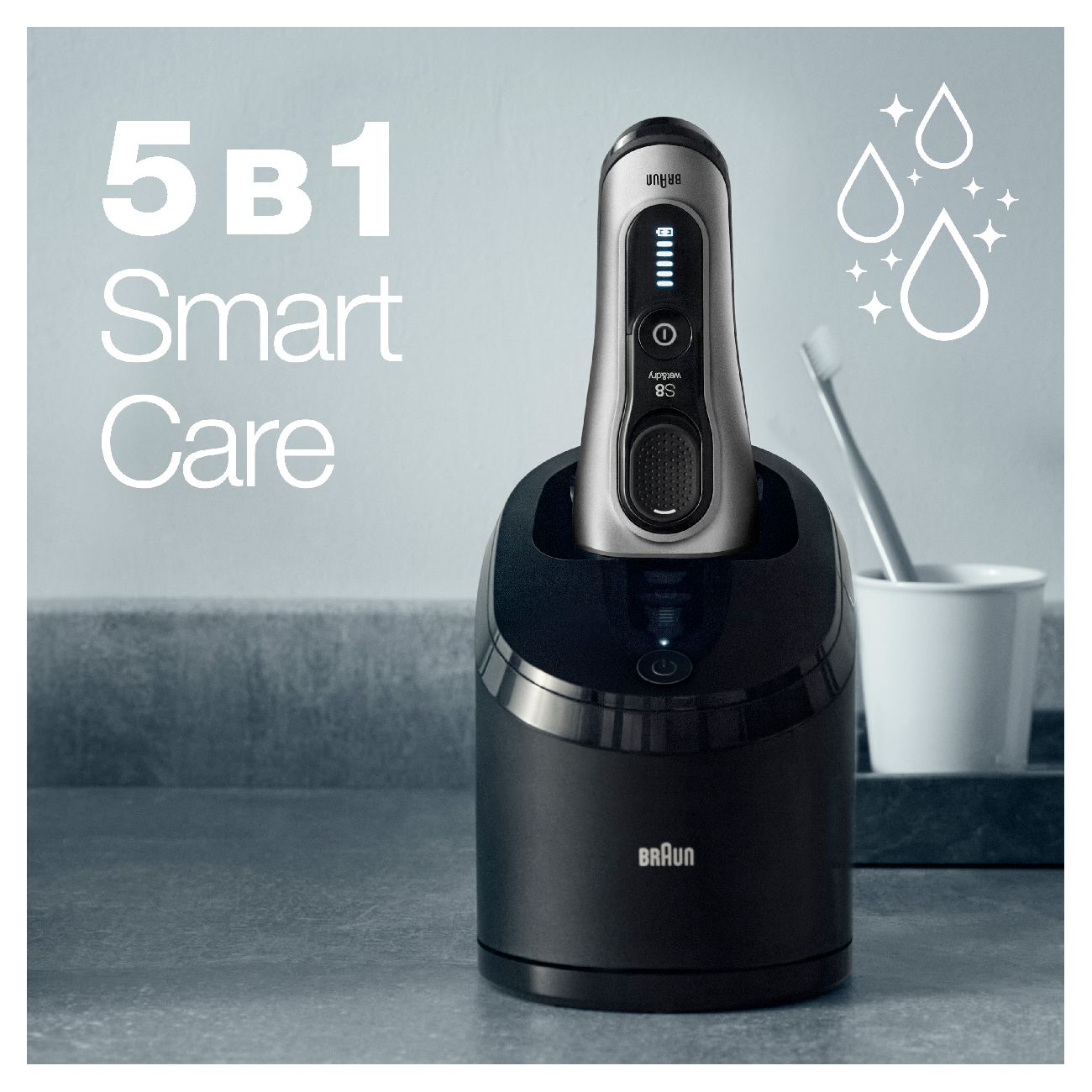 Эта электробритва быстро заряжается, очищается в специальном, так называемом стакане самоочистки.