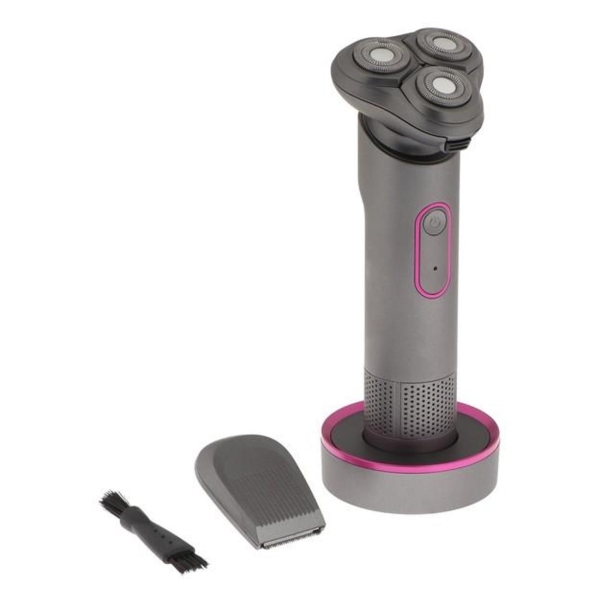 Управление бритвой кнопочное. Корпус бритвы сделан из пластика и не пропускает воду. Эргономичная ручка не скользит в ладони. В комплект входят зарядка-подставка, щеточка для очищения лезвий бритвы, насадка-триммер.