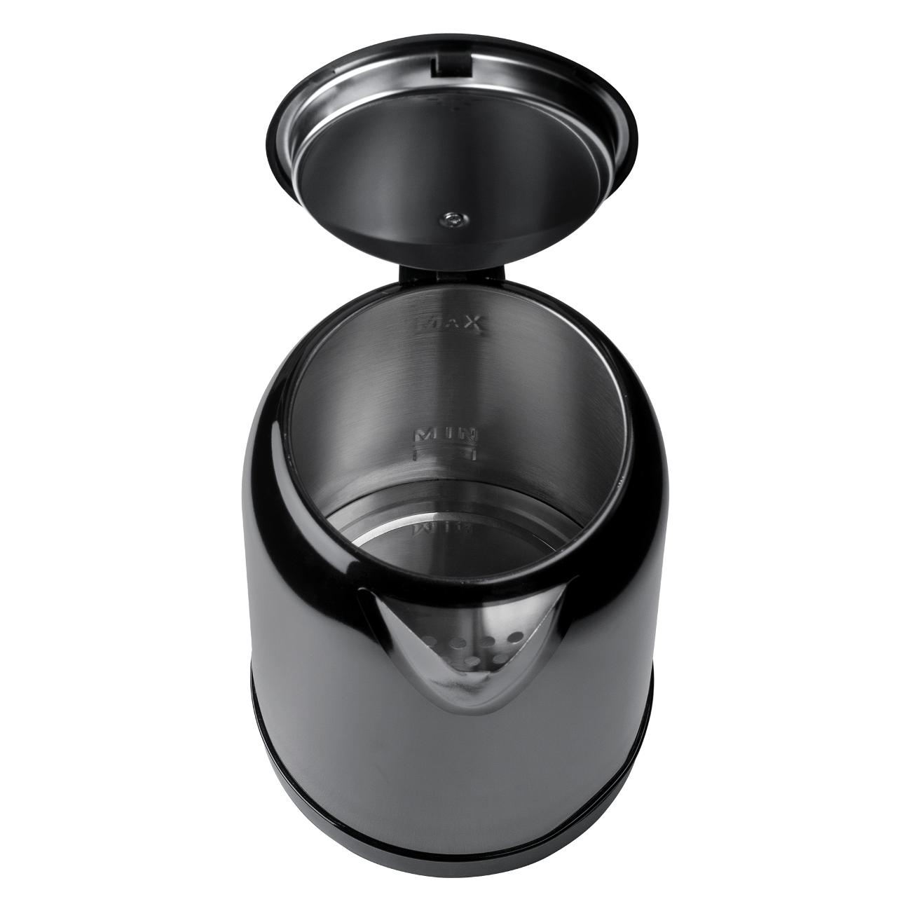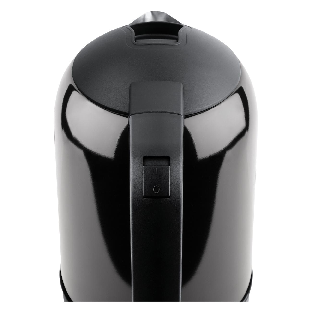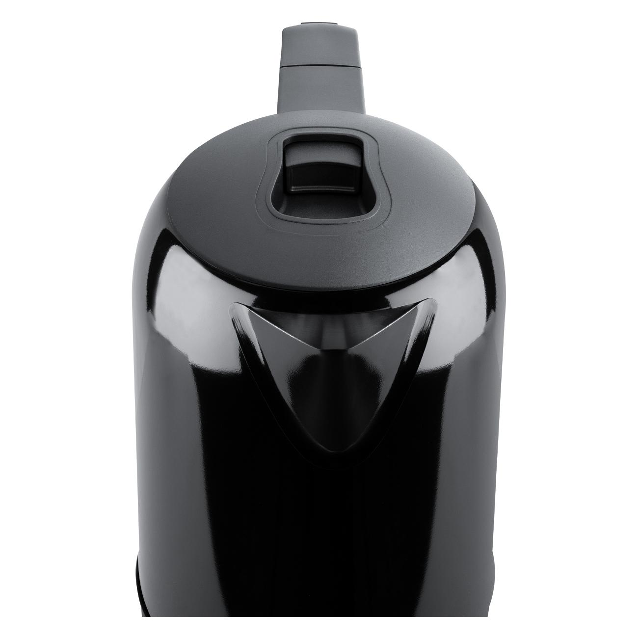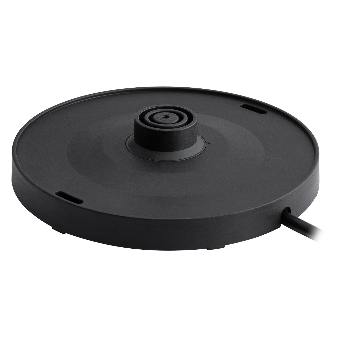 Максимальная температура нагрева — 100°С. В подставке сделан небольшой отсек для компактного хранения сетевого шнура. При закипании устройство отключается автоматически. Есть защита от включения с пустым резервуаром. Вес чайника составляет 0,75 кг.
