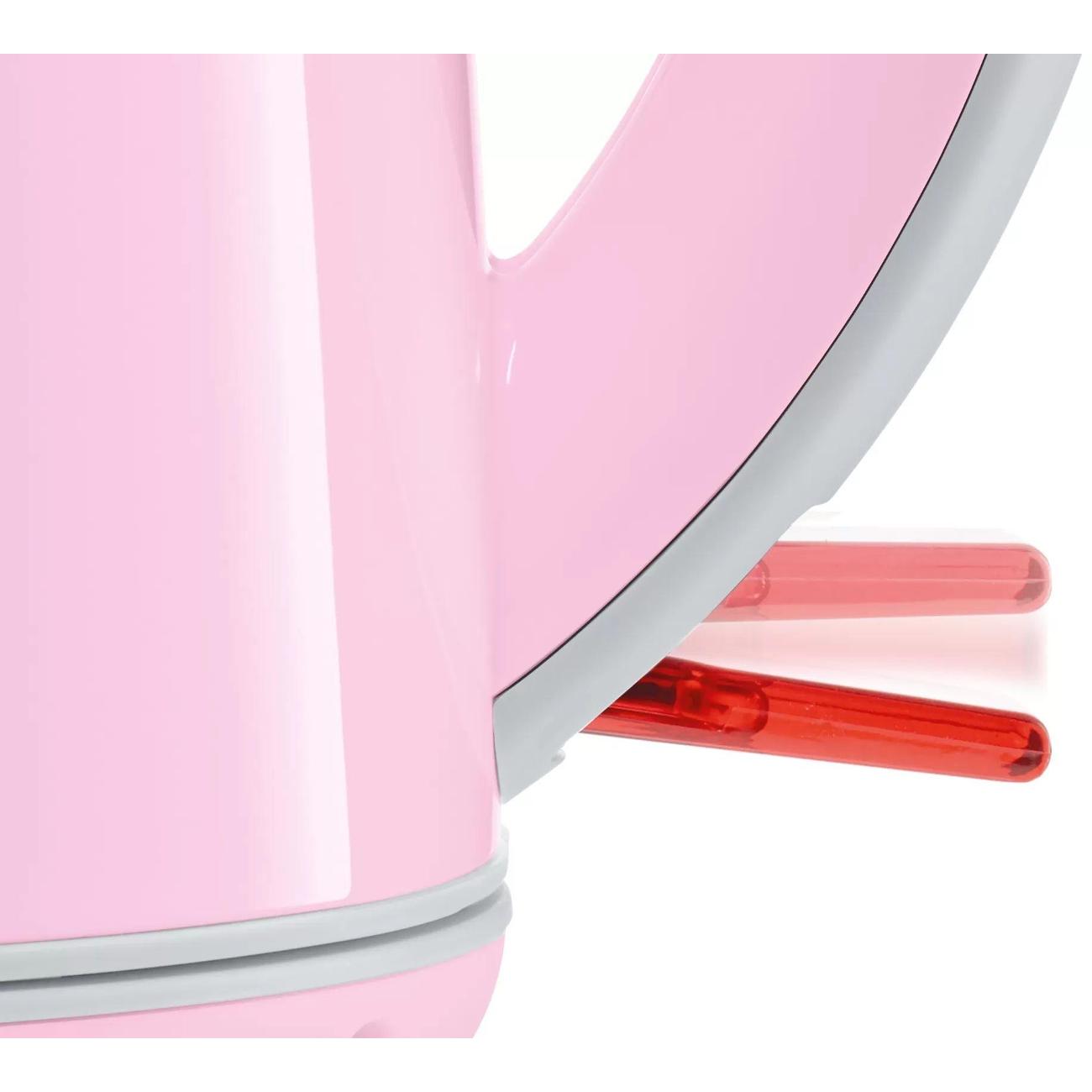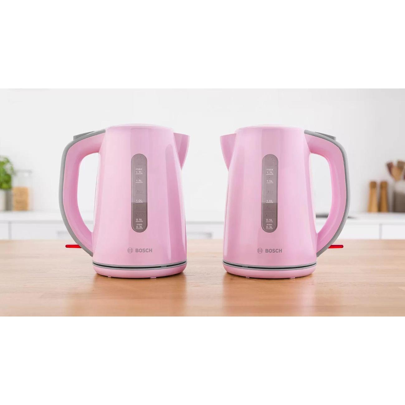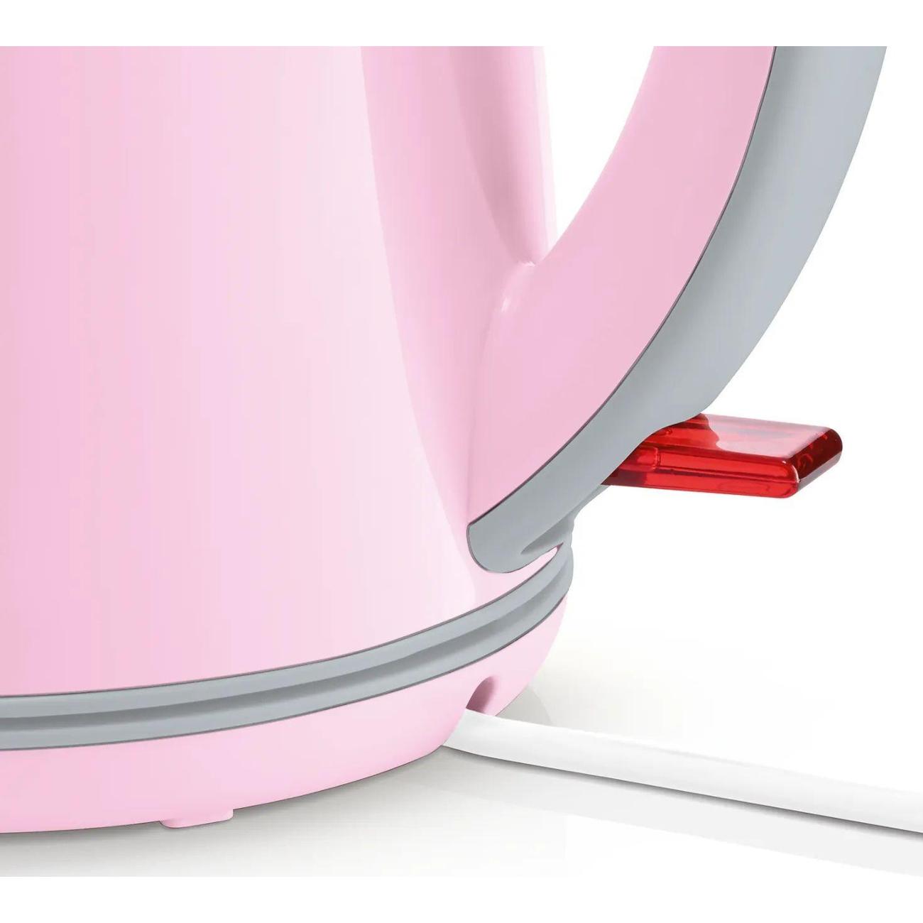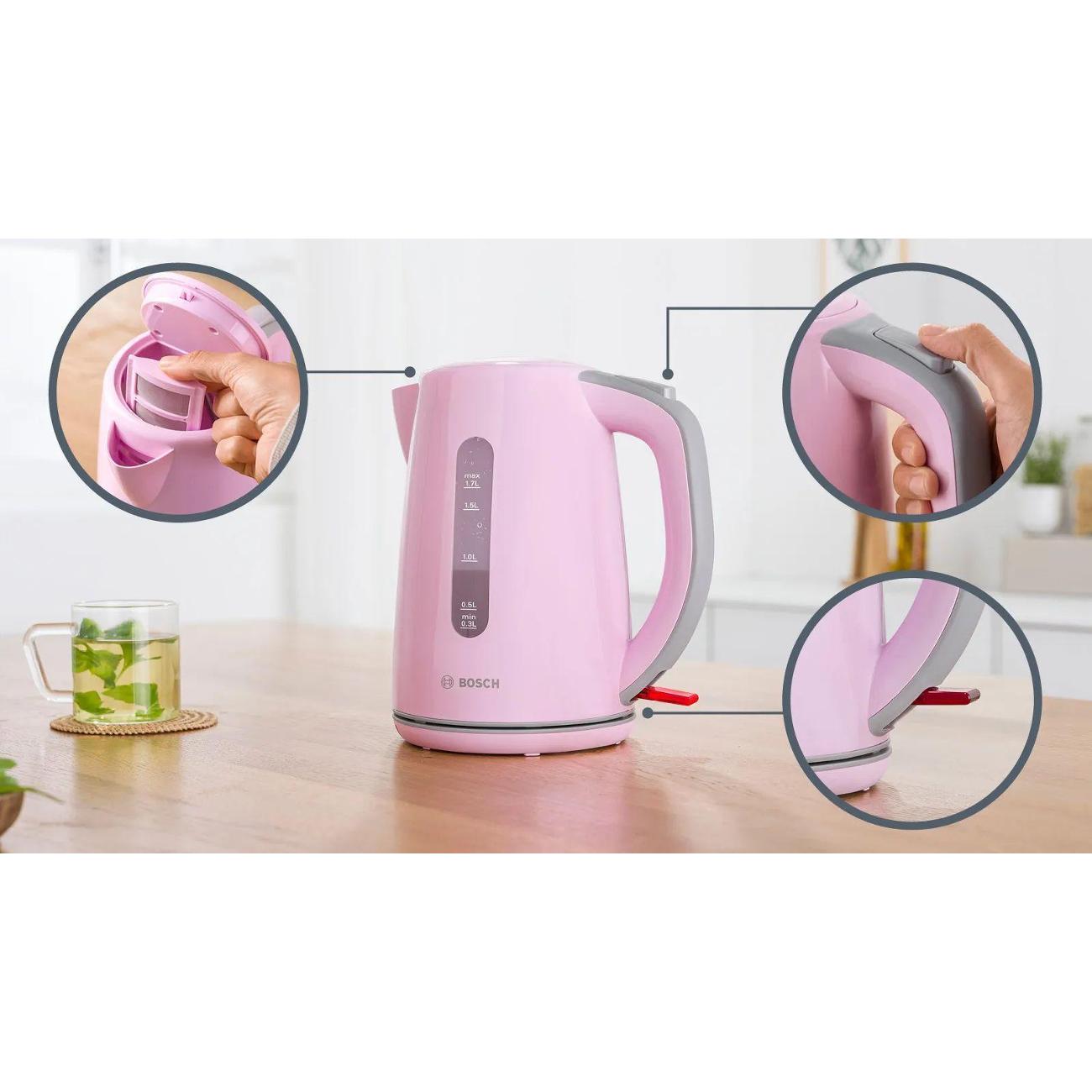 Электрочайник Bosch TWK7500K объемом 1,7 л представлен в корпусе из пластика розово-серого цвета. В носике размещается фильтр от накипи. Для управления используется механический переключатель. Для хранения сетевого шнура используется специальный отсек. Индикатор показывает включение прибора и уровень воды. Мощность составляет 2200 Вт. Установлен один режим нагрева.