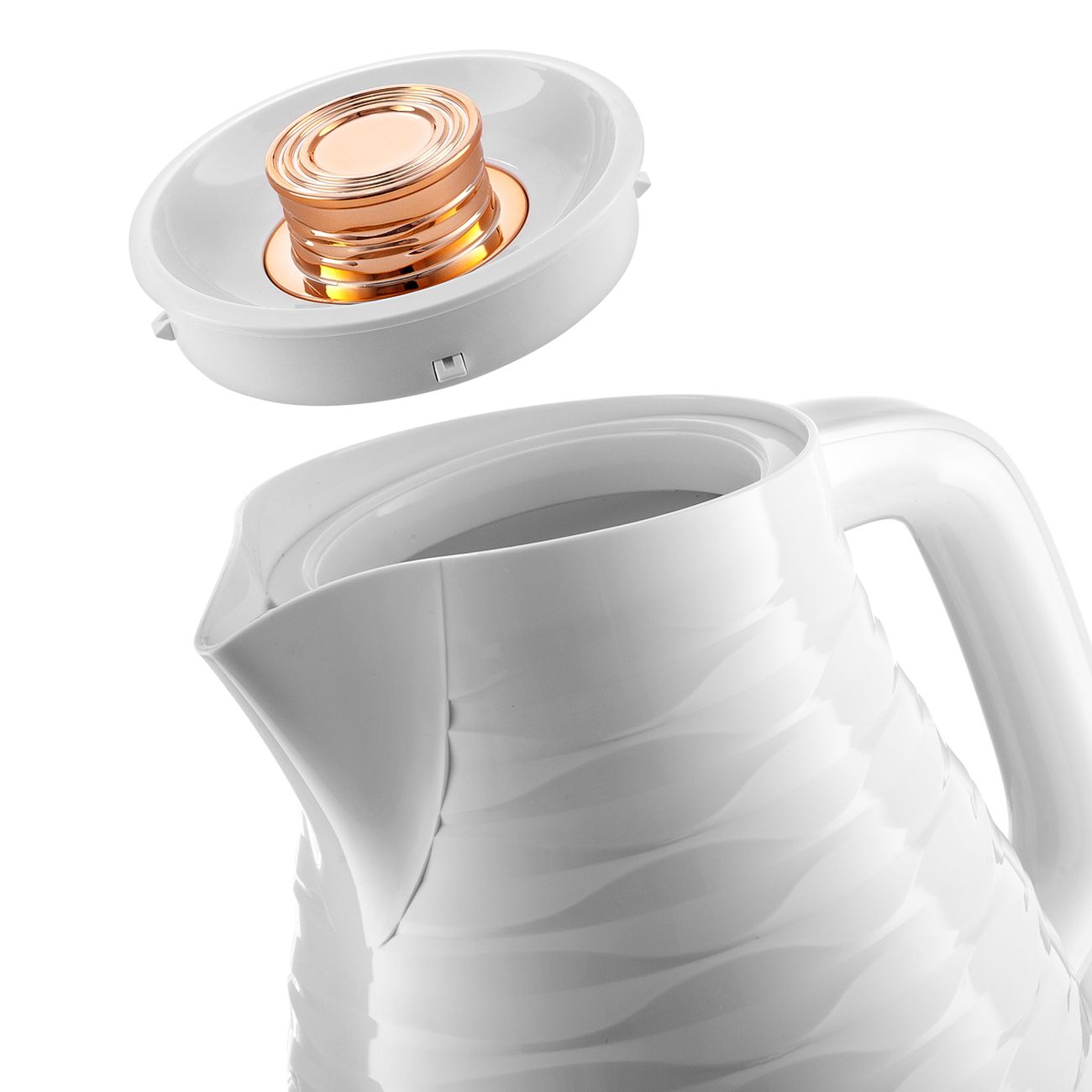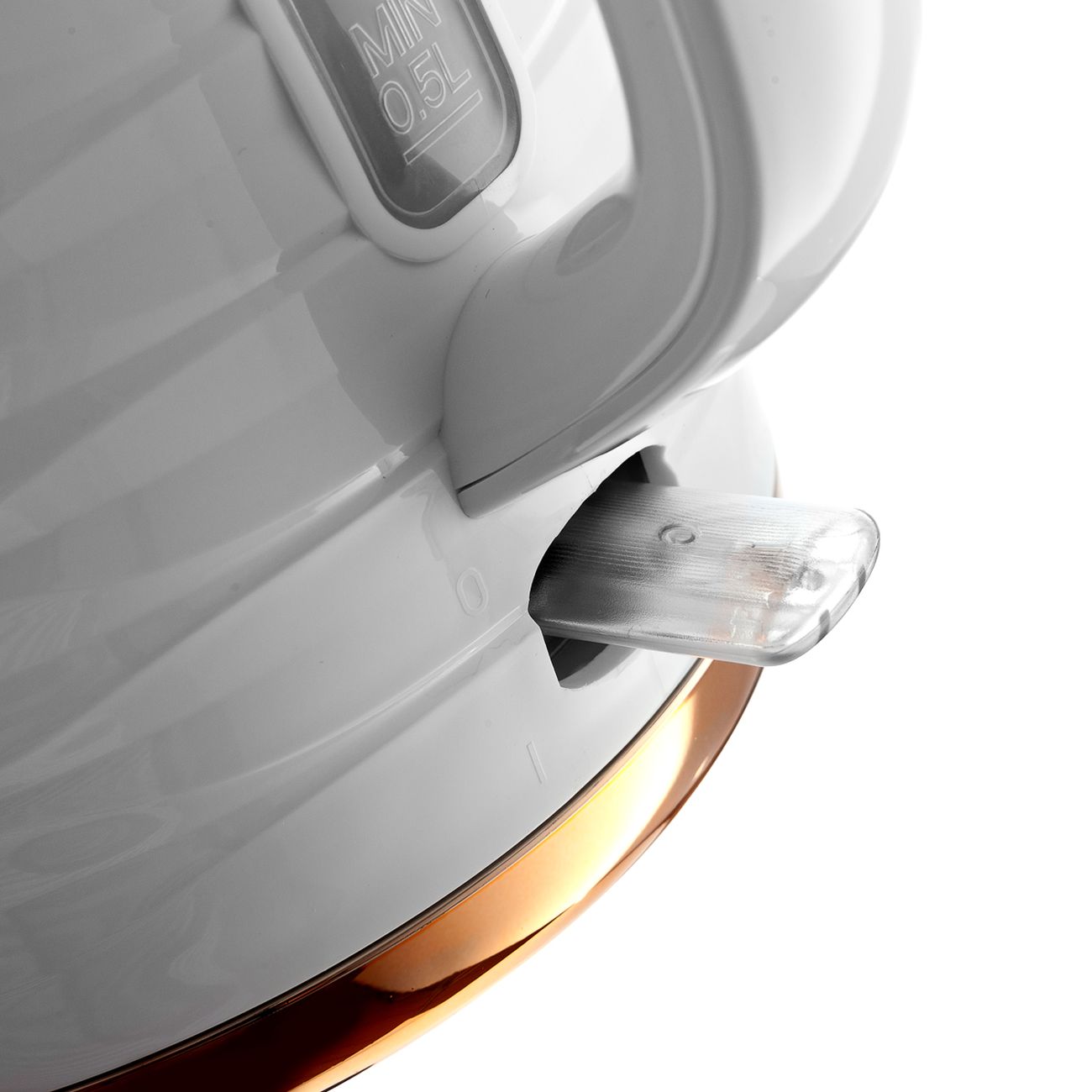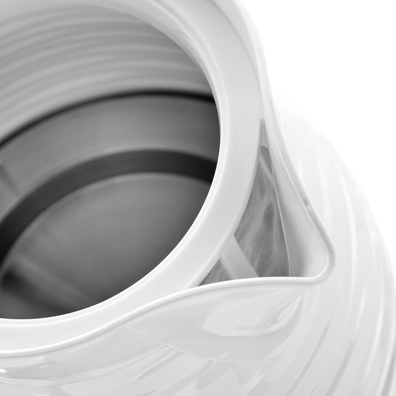 В носик встроен нейлоновый фильтр, предотвращающий попадание в чашку накипи. Скрытый нагревательный элемент не контактирует с водой, что обеспечивает отсутствие известкового налета. Длина сетевого провода составляет 60 см, в подставке предусмотрено место для его намотки. Мощность чайника — 2200 Вт, вес прибора составляет 900 г.