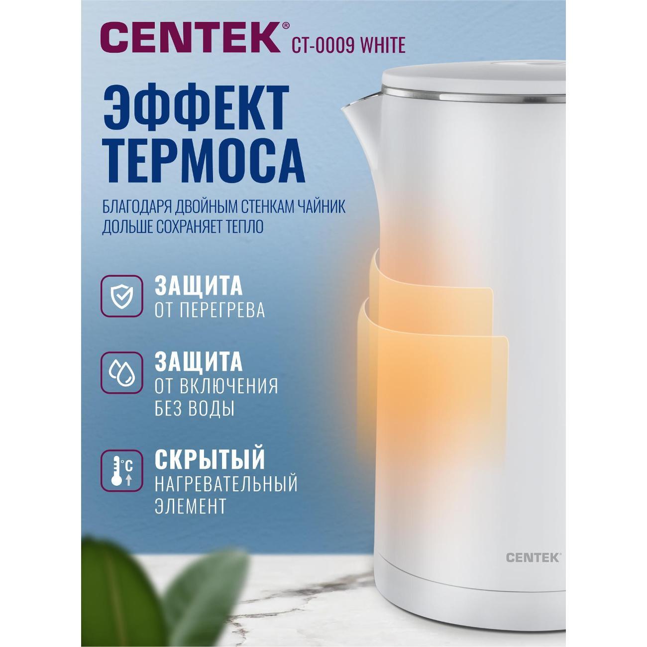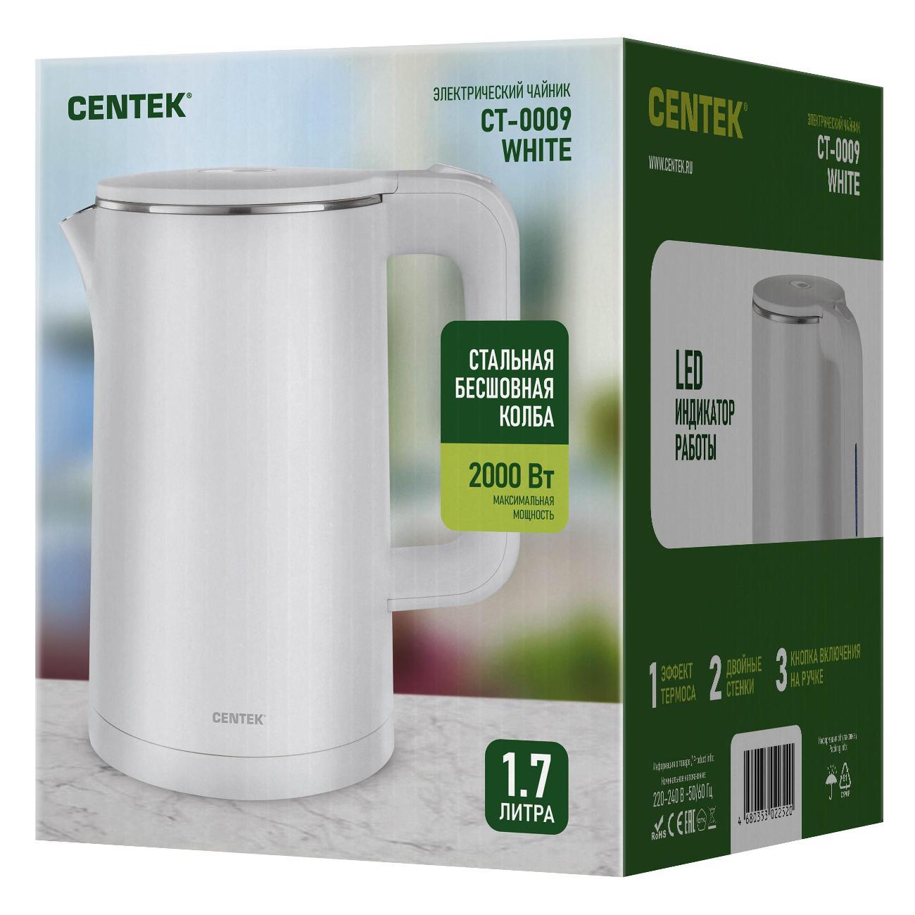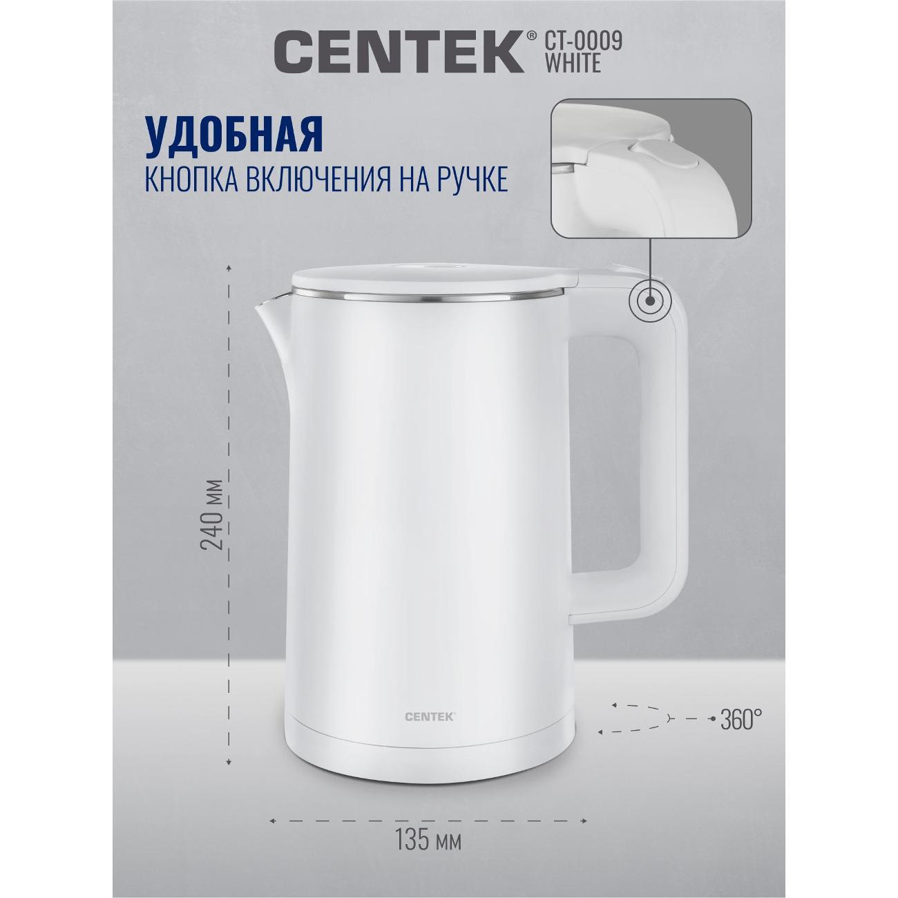 Вы можете купить Электрочайник Centek CT-0009 белый в магазинах М.Видео по доступной цене. Электрочайник Centek CT-0009 белый: подробное описание, фото и отзывы реальных покупателей, характеристики, возможность скачать инструкции и подобрать аксессуары.