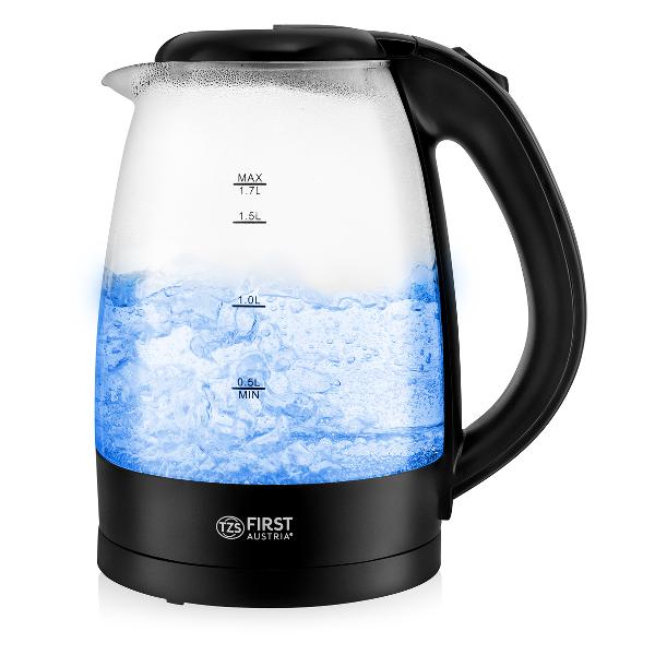 Электрочайник First FA-5404-1-BA черного цвета потребляет 2200 Вт. Резервуар для воды сделан из закаленного стекла и рассчитан на 1,7 л. При включении чайника загорается подсветка. Корпус можно вращать на 360°. Чайник отключается при закипании или отсутствии воды. Есть встроенный фильтр от накипи. На корпусе чайника располагается шкала уровня воды. Управление прибором механическое. Масса чайника составляет 1,2 кг.