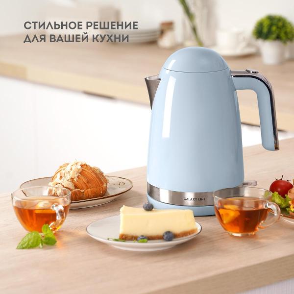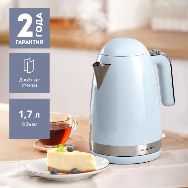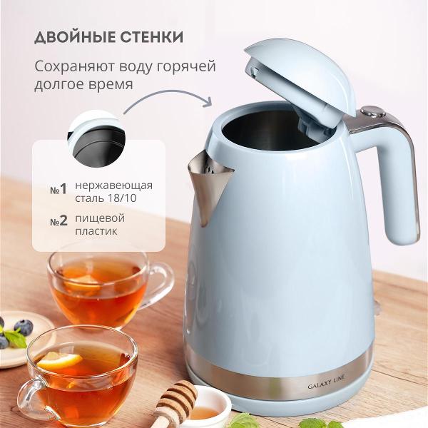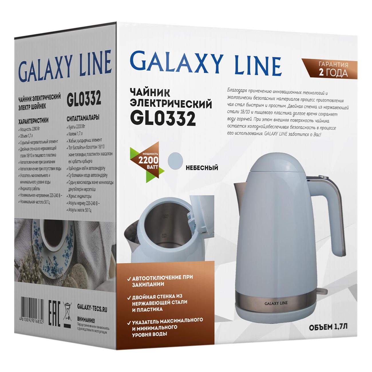 Электрочайник Galaxy Line GL0332 небесного цвета отключается автоматически при перегревании, отсутствии жидкости в колбе и после закипания. Присутствует функция поддержания тепла, фильтр, предотвращающий попадание накипи в чашку. Способ управления — электронный/механический. Габариты модели — 24х22х17 см. Вес — 1,23 кг. Корпус с двойными стенками сделан из прочного гигиеничного пластика и стали, оснащен отсеком для шнура. Мощность — 2,2 кВт. Прибор вмещает до 1,7 л жидкости. Стальная колба не подвержена коррозии, воздействию солей, препятствует размножению бактерий.