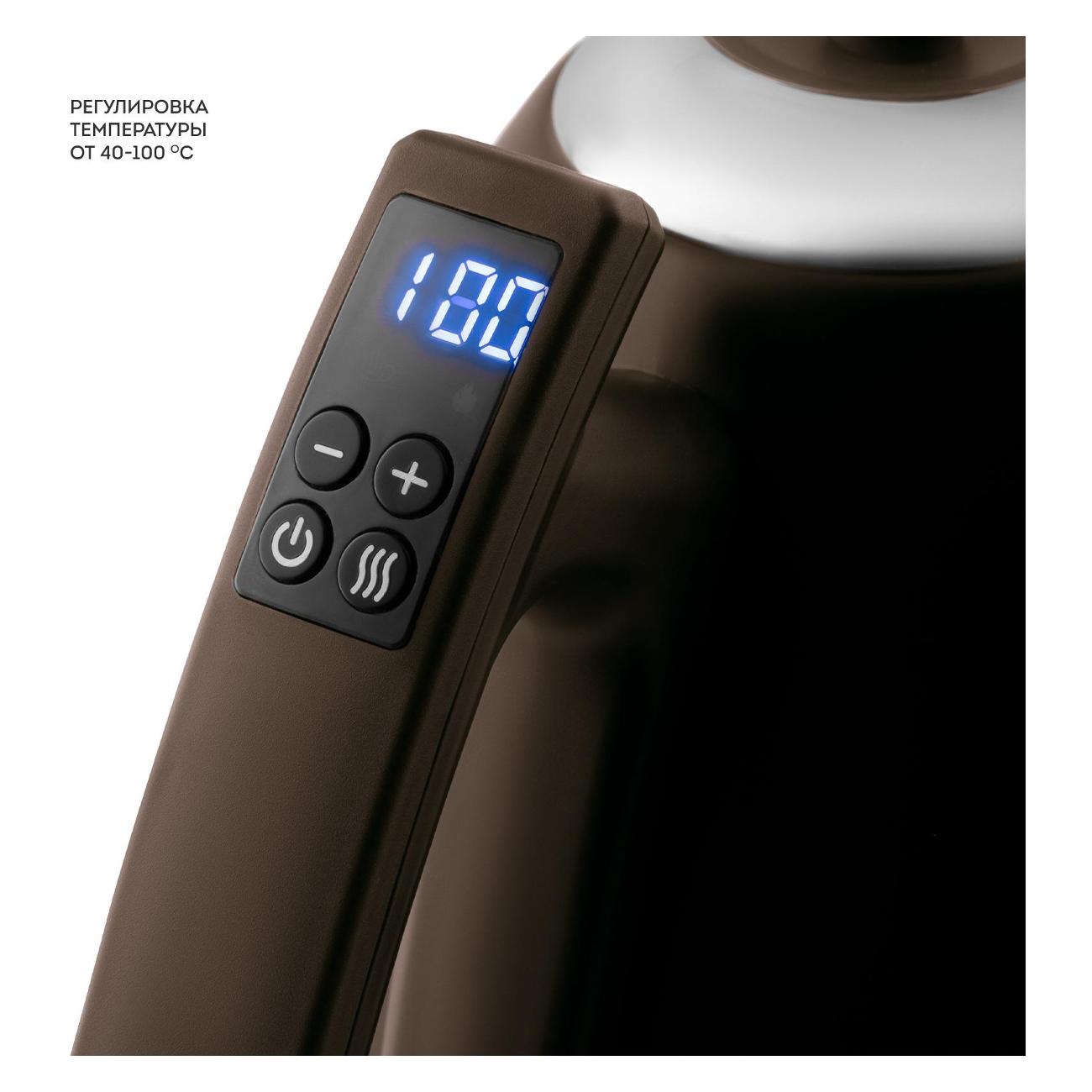 У прибора электронное управление, панель с кнопками и цифровым дисплеем расположена в верхней части ручки. Доступна регулировка температуры нагрева в диапазоне от 40°С до 100°С, что позволит заваривать разные сорта чая или кофе правильно, кроме того, функция пригодится для приготовления детского питания. Чайник может поддерживать тепло, что более экономично, чем повторное кипячение.