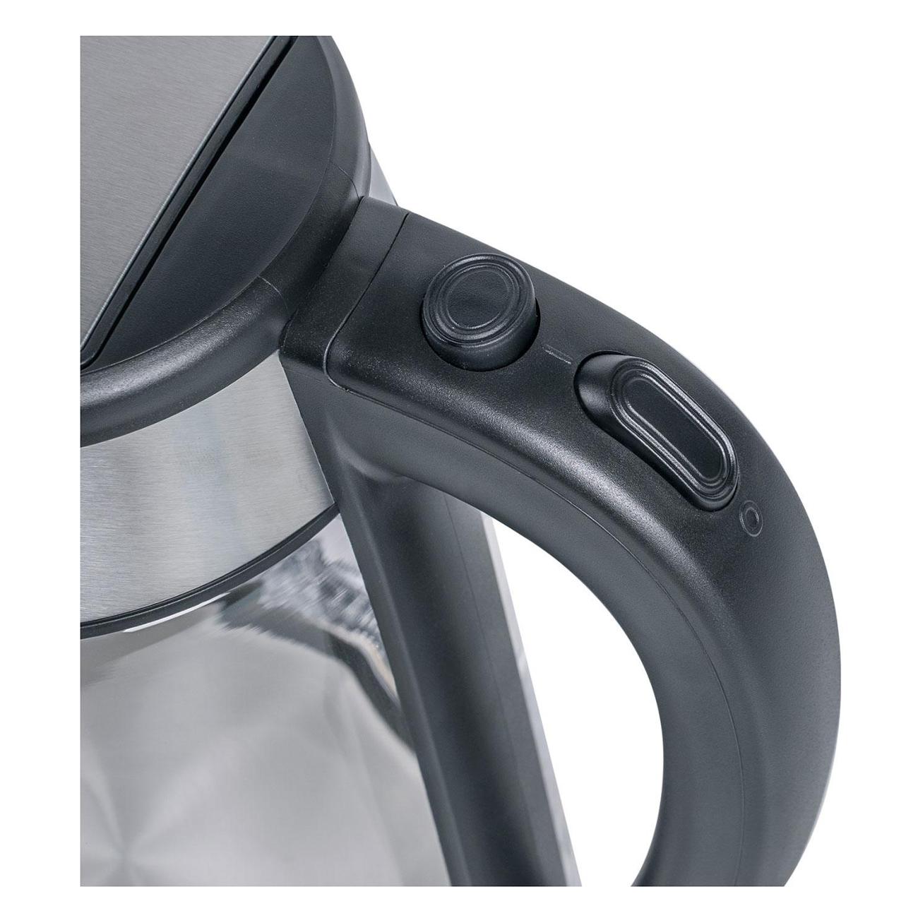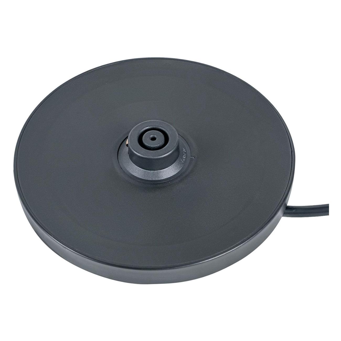 Потребляемая мощность прибора — 2200 Вт. Встроен скрытый нагревательный элемент, который дает возможность быстро вскипятить жидкость. Чайник предусматривает автоматическое отключение при отсутствии воды и функцию блокировки при снятии с подставки. Сетевой шнур можно хранить в специальном отсеке в базе. Активация устройства осуществляется посредством кнопки, расположенной на ручке. Вес модели — 1,2 кг.