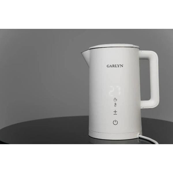 Электрочайник Garlyn K-250S в корпусе белого цвета оснащен сенсорной панелью управления. Температура нагрева устанавливается в диапазоне от 40°С до 100°С, заложены функции быстрого кипячения и поддержания температуры. Прибор можно синхронизировать со смартфоном и задавать параметры в приложении.