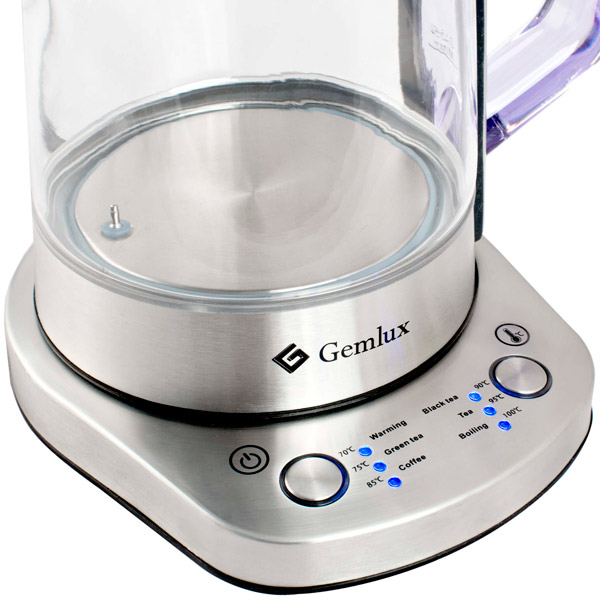 Корпус электрического чайника Gemlux GL-EK-302G изготовлен из нержавеющей стали, колба – из закалённого стекла. Все материалы – экологически безопасные. Вместимость – 1,5 л воды, такого объёма вполне хватит для чаепития семьи из трёх или четырёх человек.