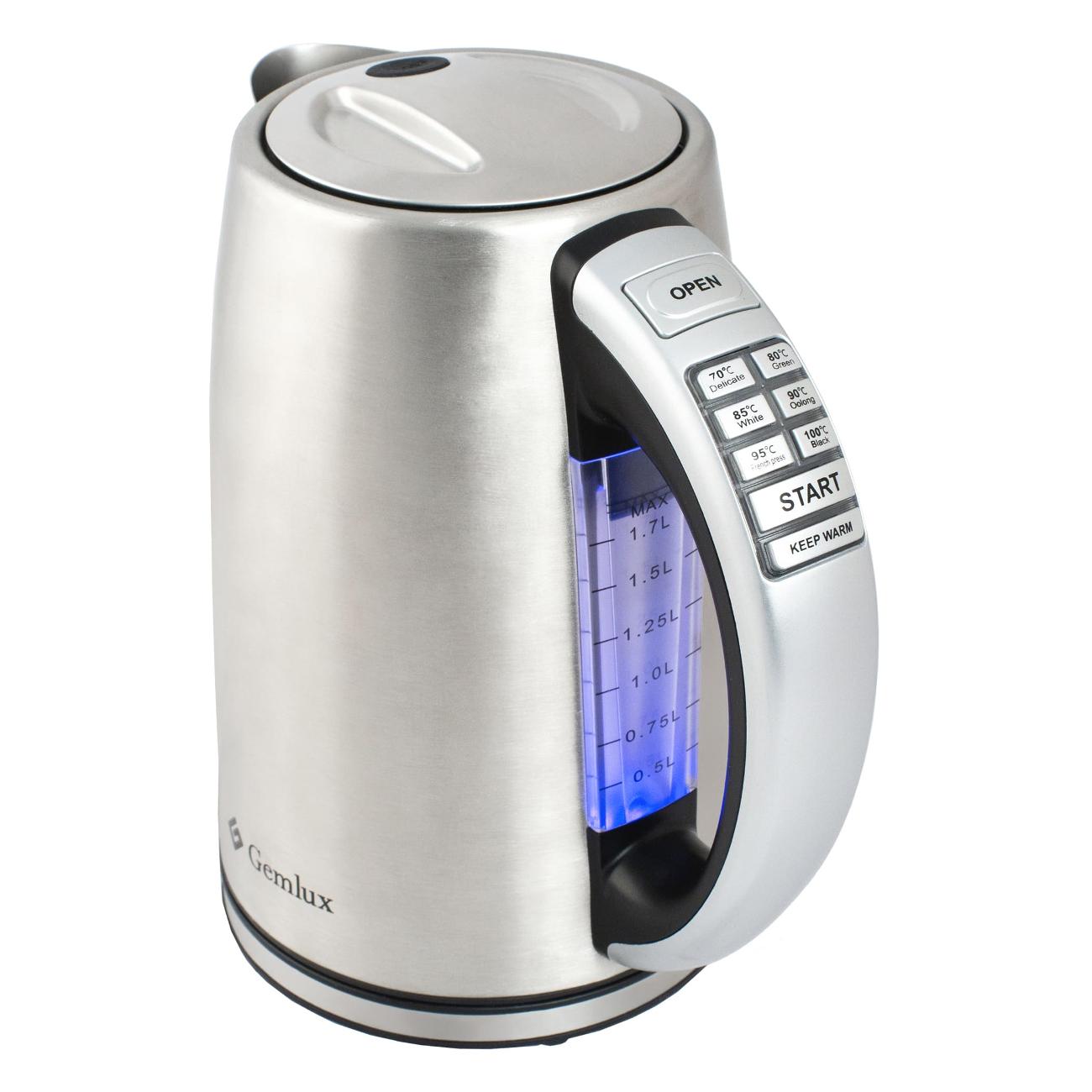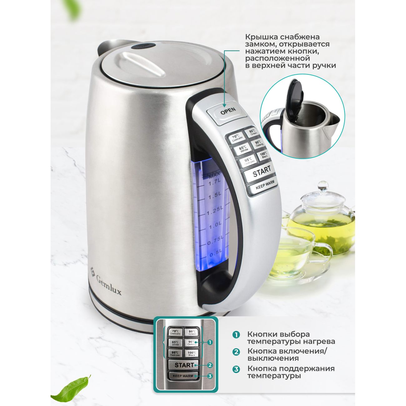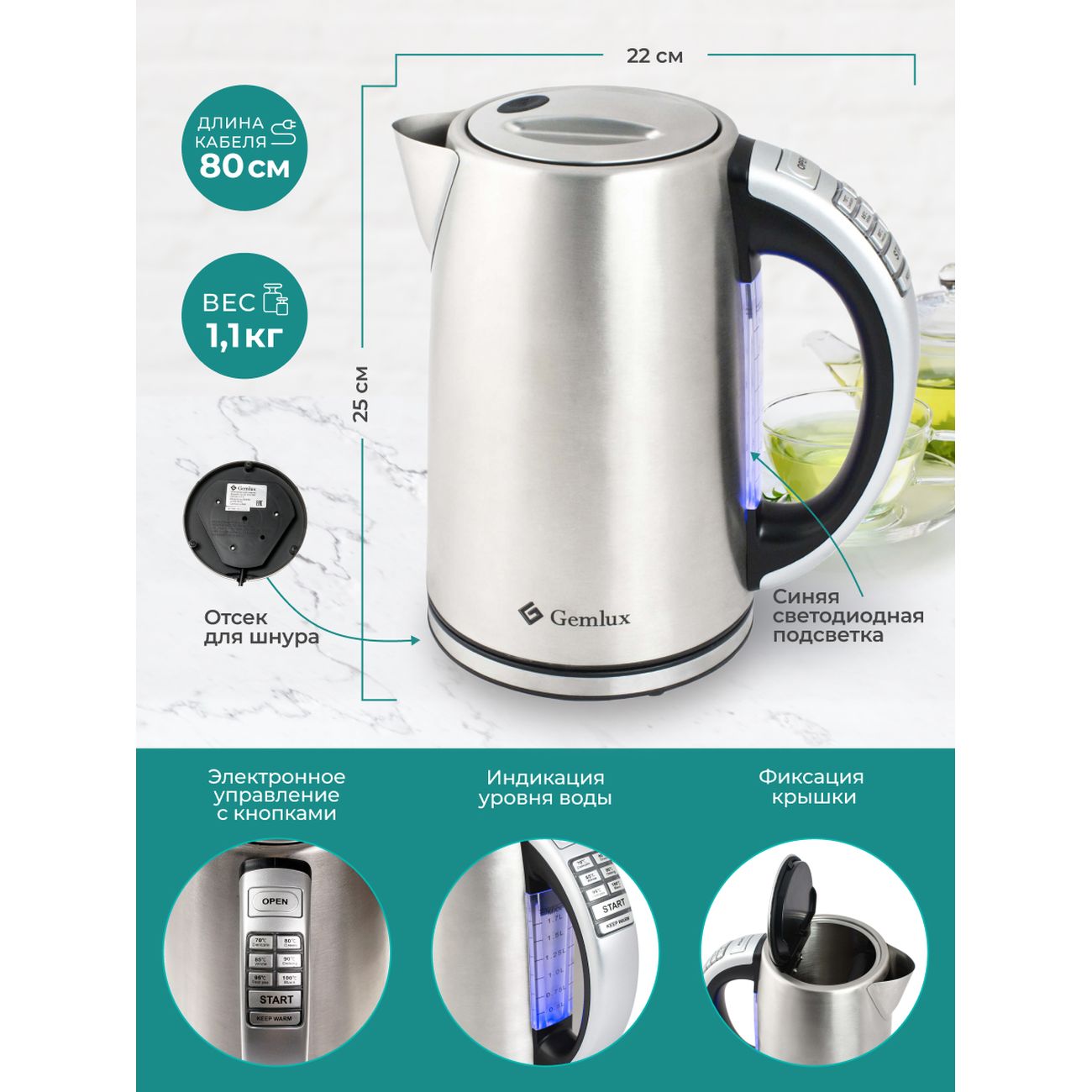 Электрочайник Gemlux GL-EK-9217WF стального цвета весит 1,1 кг. Максимальный объем — 1,7 л. Высота устройства составляет 25 см, ширина — 15,5 см, глубина — 22,2 см.