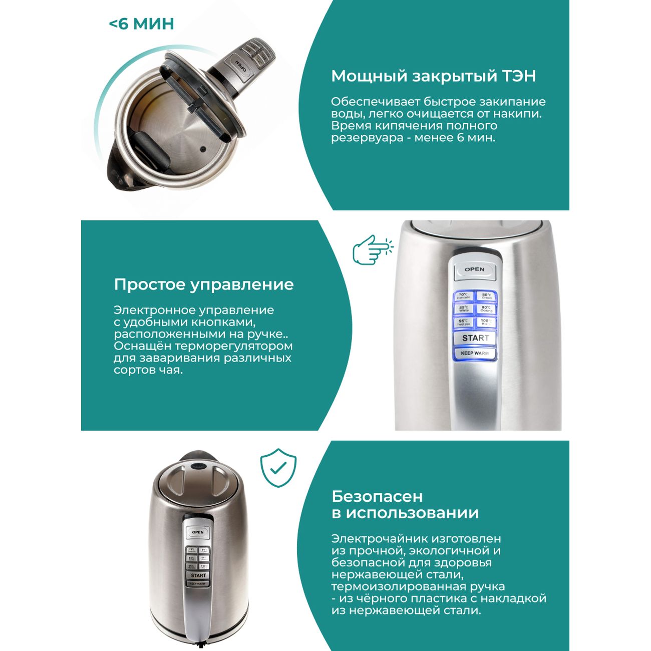 Корпус электрочайника изготовлен из стали, термоизолированная ручка — из пластика. Есть фильтрующее ситечко.
