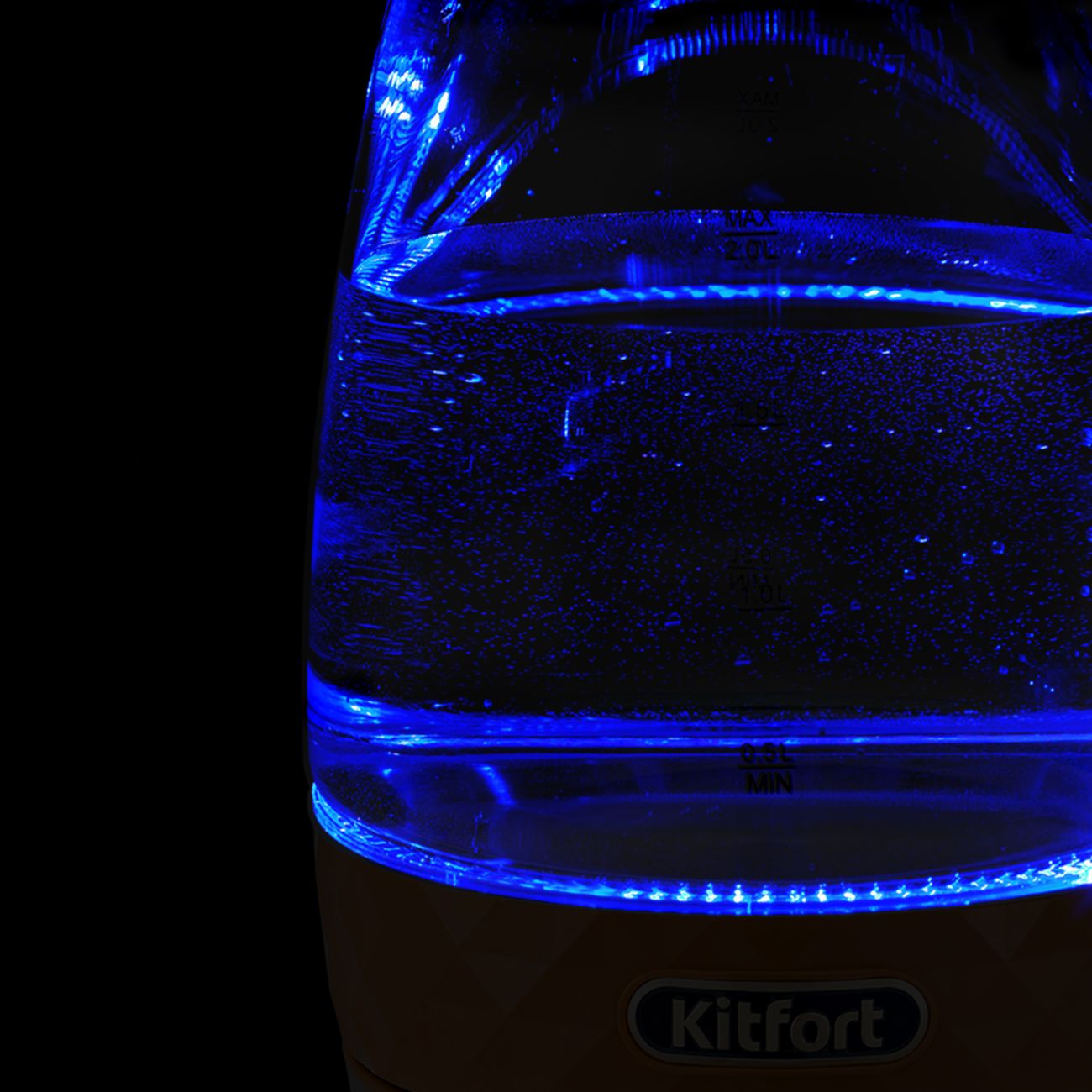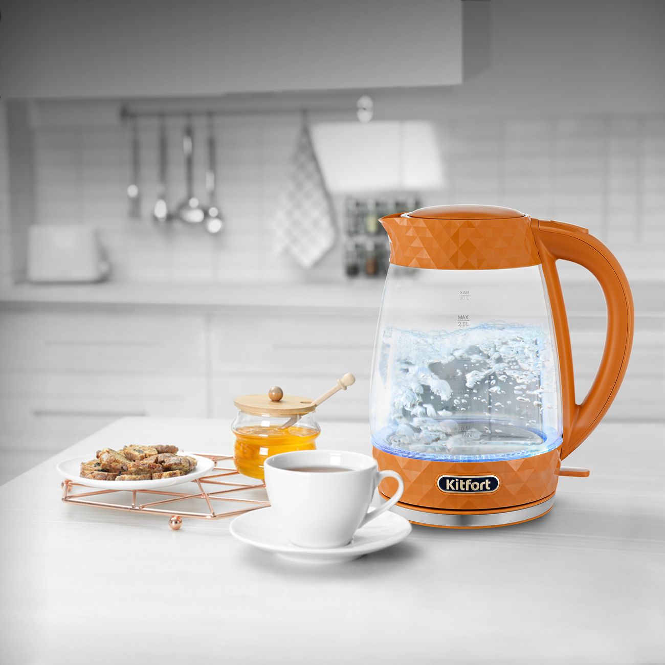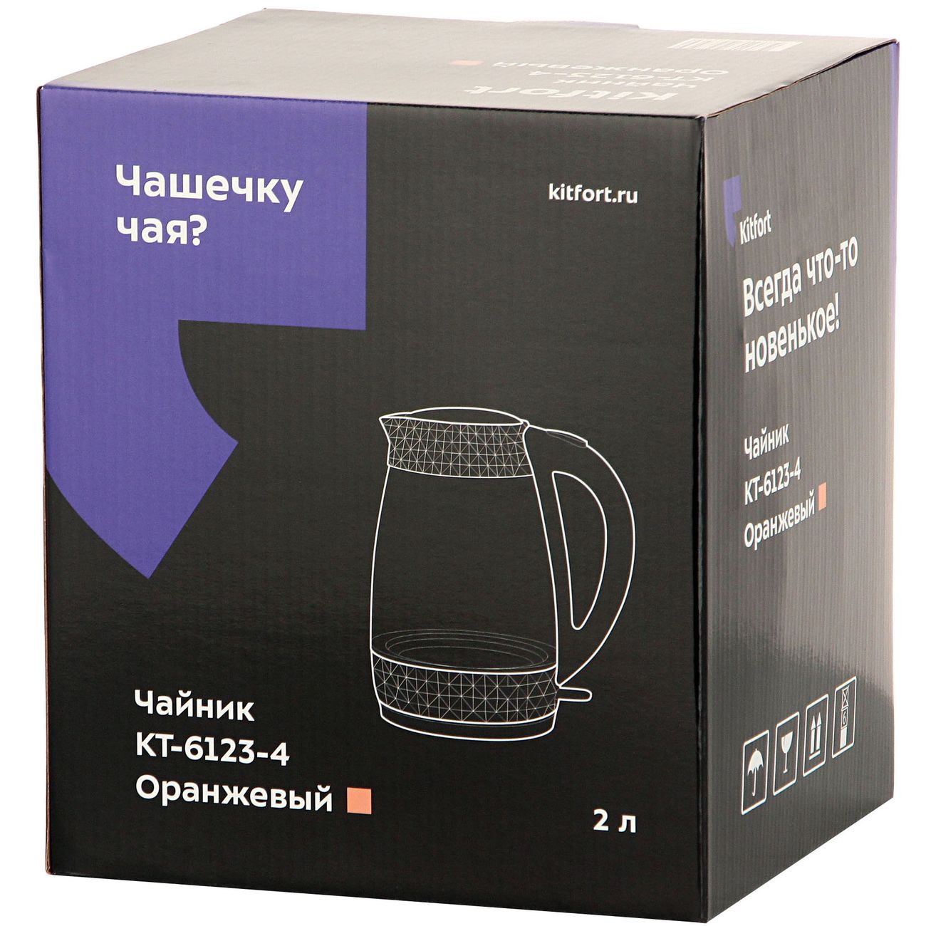 Kitfort КТ-6123-4 – электрочайник с необычным ярким дизайном. Благодаря большому объёму колбы, составляющему 2 л, вы без проблем наполните горячим напитком до восьми средних чашек за раз.