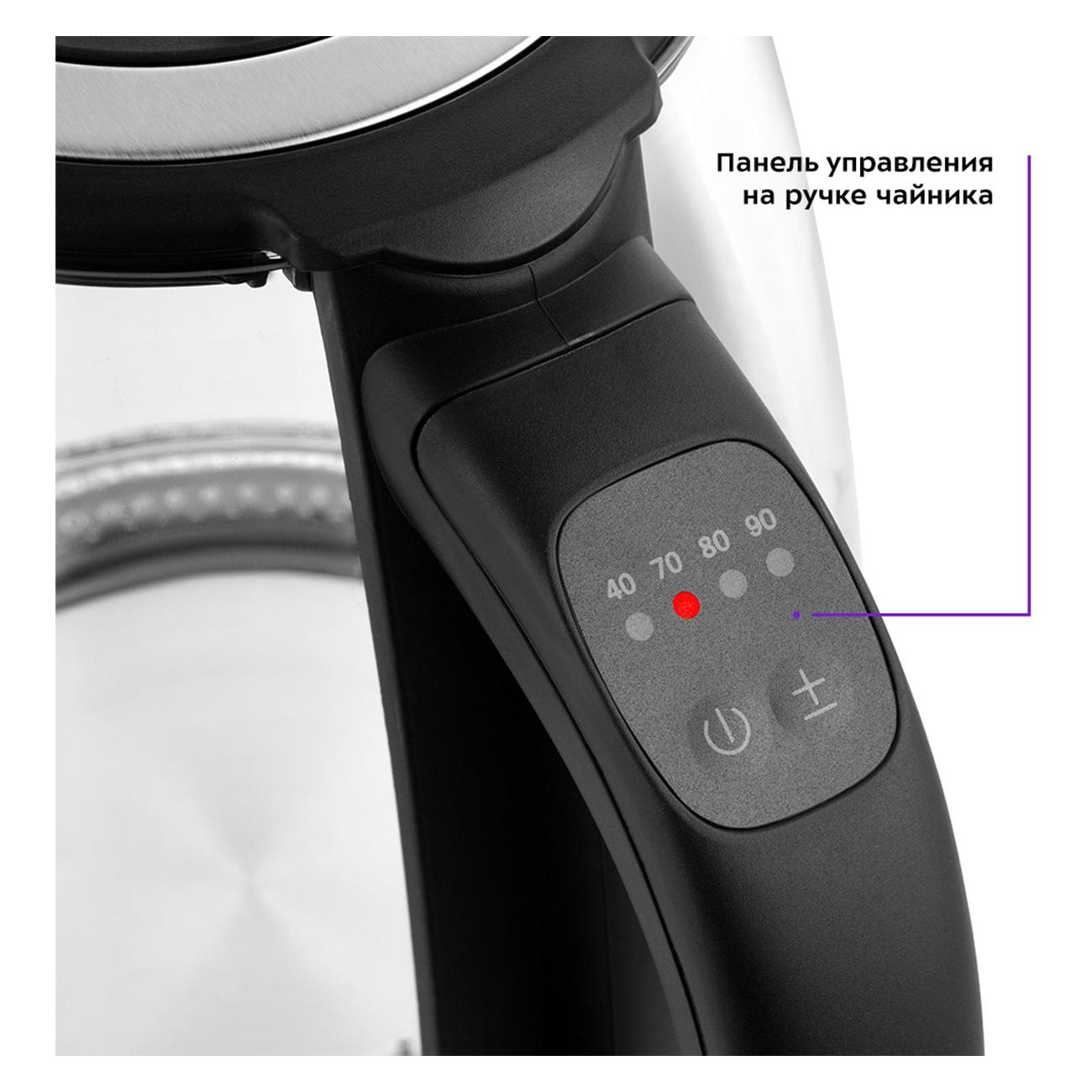 Диапазон температуры нагрева составляет 40–100°С, что позволяет выбрать необходимую при заваривании разных сортов чая или при приготовлении кофе.