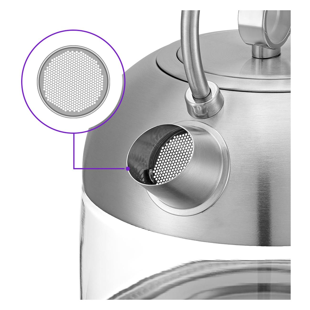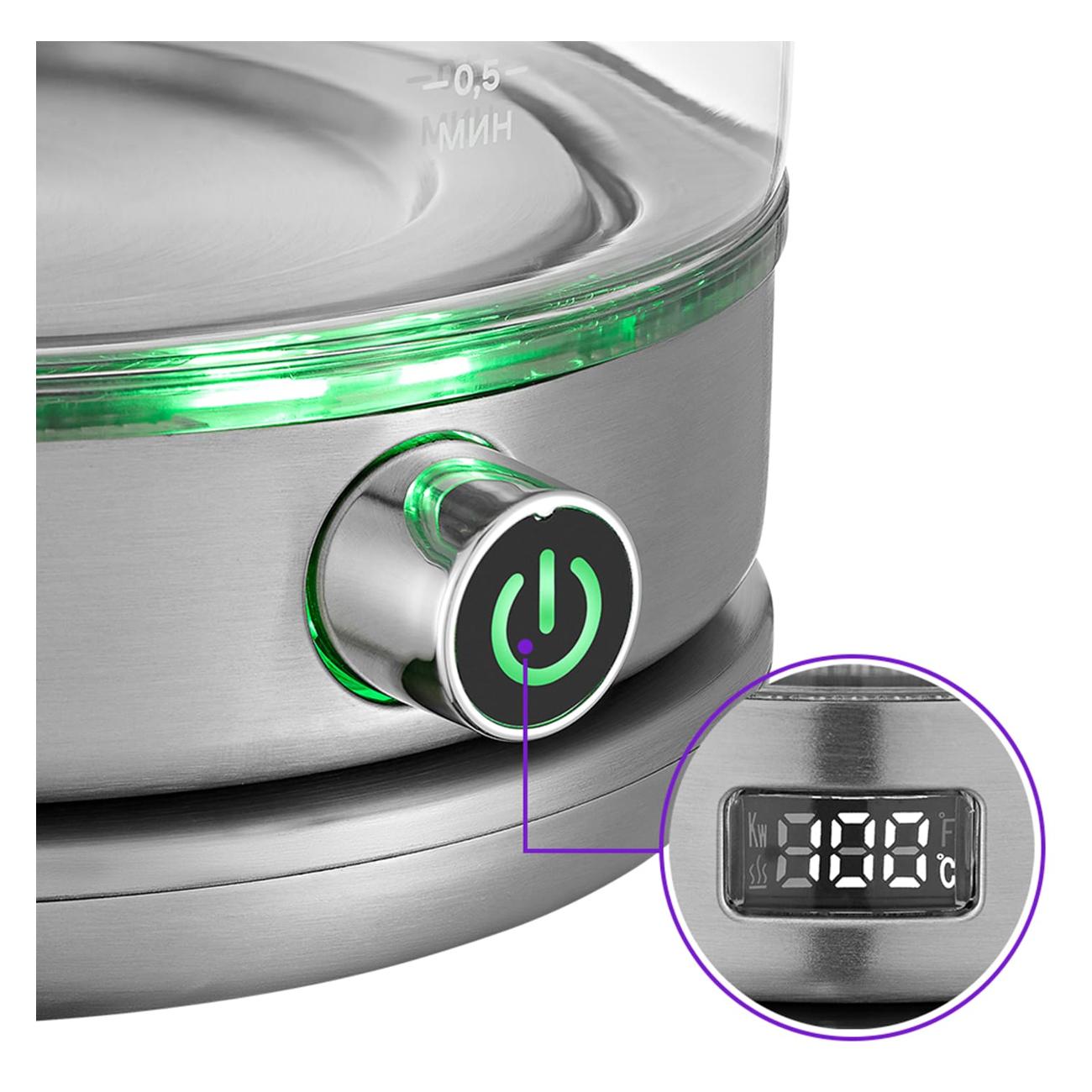 Чайник выбирала по электронному каталогу, понравился по фото , но представляла его размер меньше , чем он оказался. Из плюсов- негромкий, выбор температуры и табло с актуальной температурой. Не было никаких посторонних запахов . Для меня минус что при постановке на базу издает два гудка (хватило бы одного) . Подсветка не по кругу , а только на кнопке и около нее. Два цвета зеленый и красный. В целом люблю стеклянные чайники, этот нравится , лишь бы проработал хотя бы год.