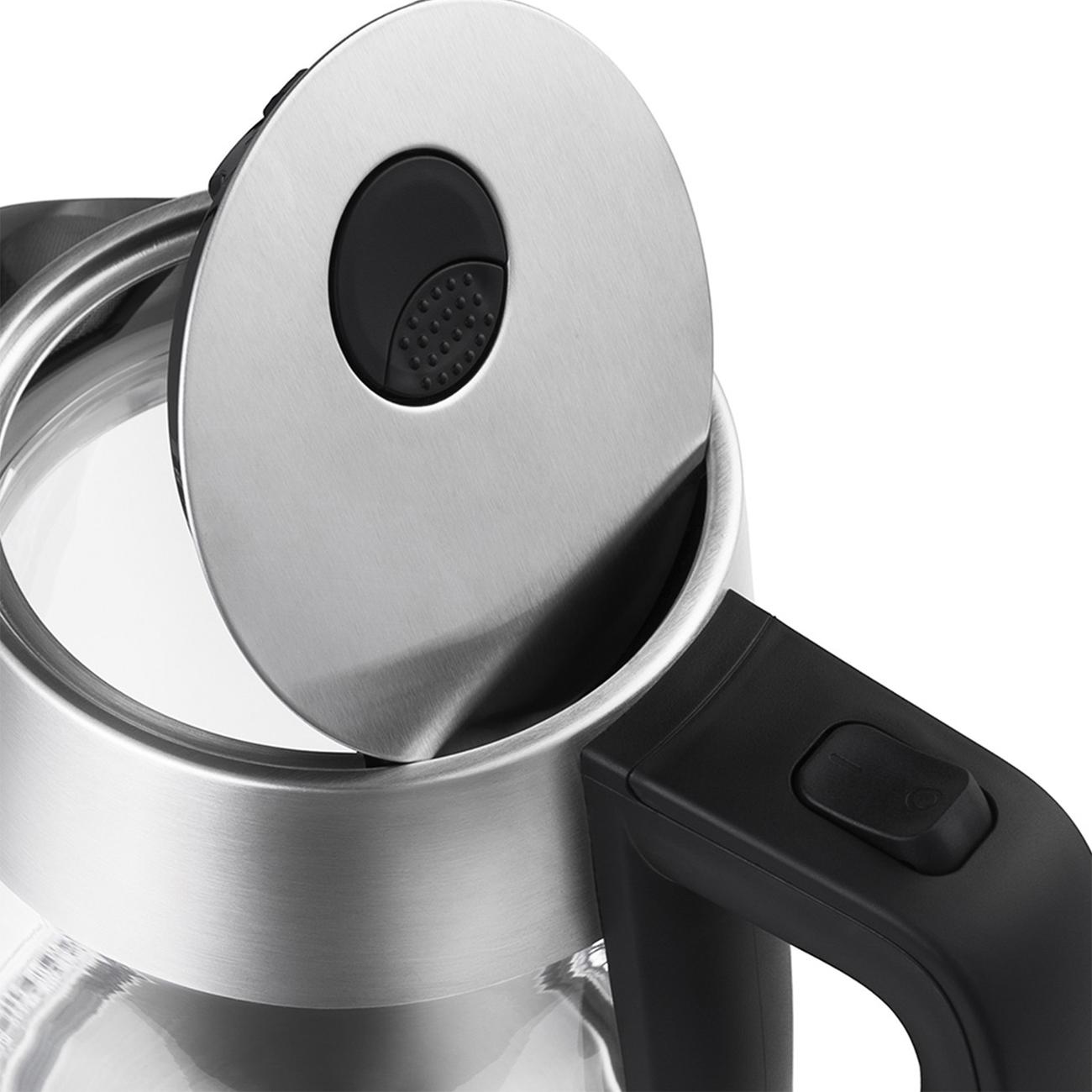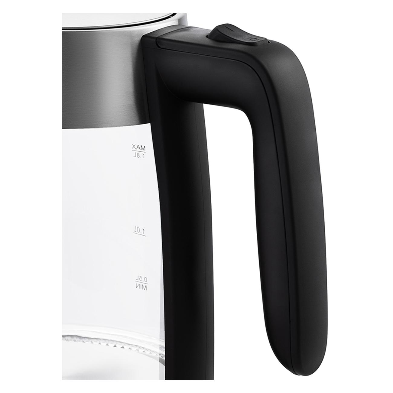 Сам корпус чайника из стекла, как положено, есть сеточка. Мерная кала нанесена на корпус чайника. Швы спаяны хорошо, не подтекает, внизу есть подсветка, подсвечивает голубым, на глаза не давит, приятный цвет.