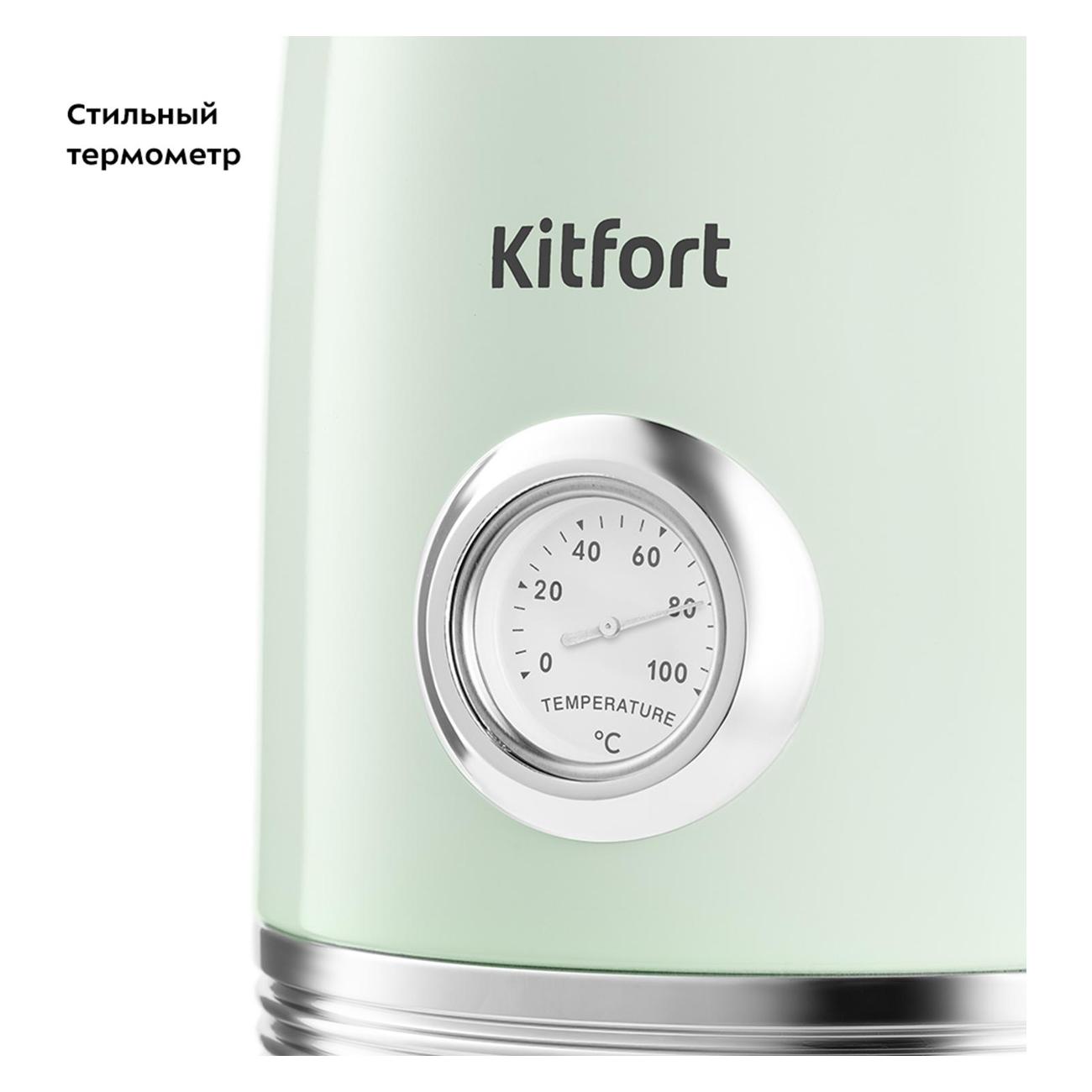 Электрочайник Kitfort КТ-6604 — модель объемом 1,7 л, оснащенная винтажным термометром, который отображает температуру воды. Потребляемая мощность не превышает 2150 Вт. Для подключения к сети используется кабель длиной 0,7 м — для его хранения в корпус предусмотрен специальный отсек.