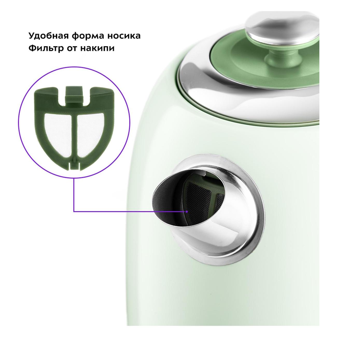 Кнопка включения/выключения оснащена индикатором нагрева. За счет специальной формы носика можно точно наливать кипяток в чашку, не расплескивая его и не создавая брызг. Встроенный фильтр не позволит накипи попасть в напиток. Полностью съемная крышка облегчает доступ внутрь устройства, что упрощает уход за ним. Нагревательный элемент размещен в донной части и закрыт сверху пластиной, выполненной из нержавеющей стали. Подобная конструкция способствует снижению уровня шума при работе чайника. Предусмотрено отключение при закипании, снятии с базы и отсутствии воды в емкости. Вес модели — 0,86 кг.