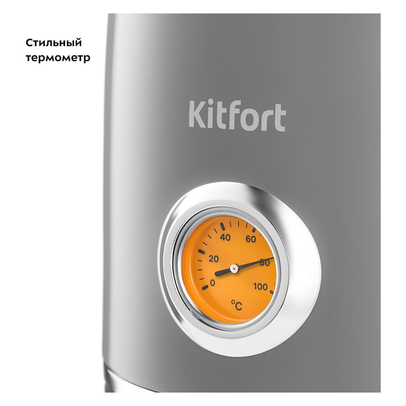 Электрочайник Kitfort КТ-6605 оснащен встроенным винтажным термометром, который позволяет контролировать температуру воды для заваривания чая разных сортов. Удобная форма носика позволяет избежать разбрызгивания. Крышка устройства снимается, что упрощает уход за устройством.